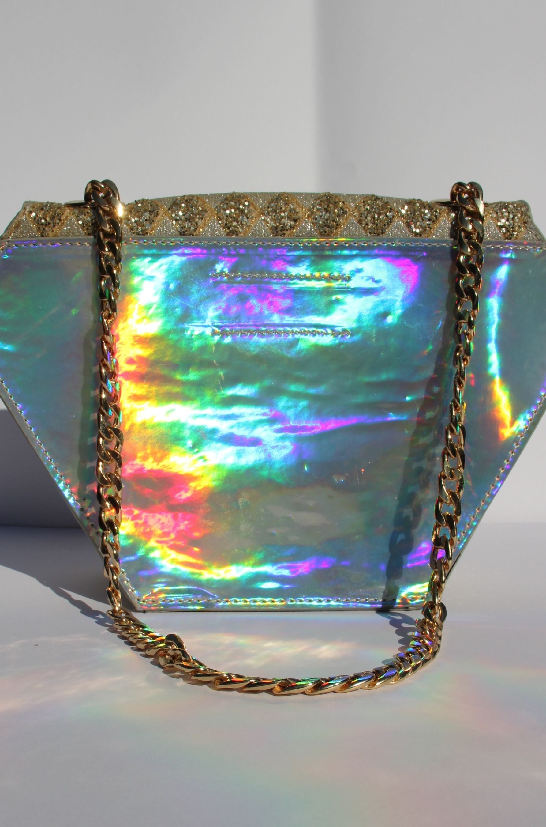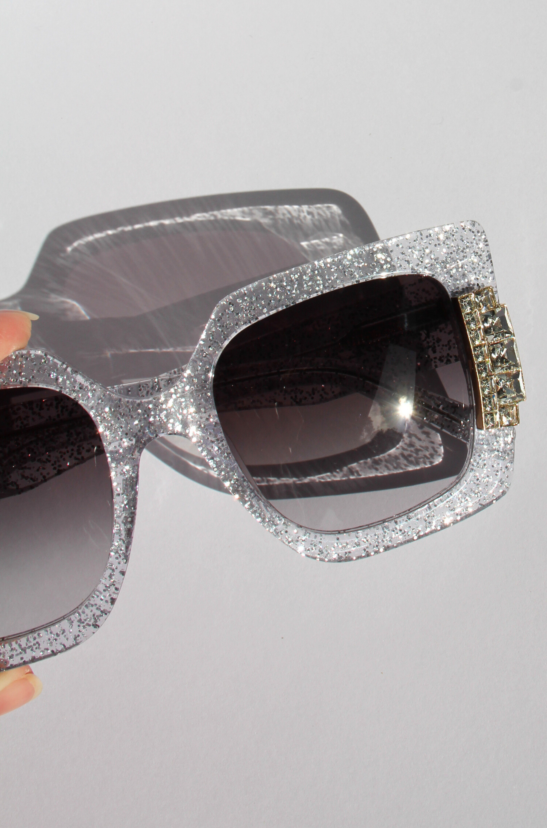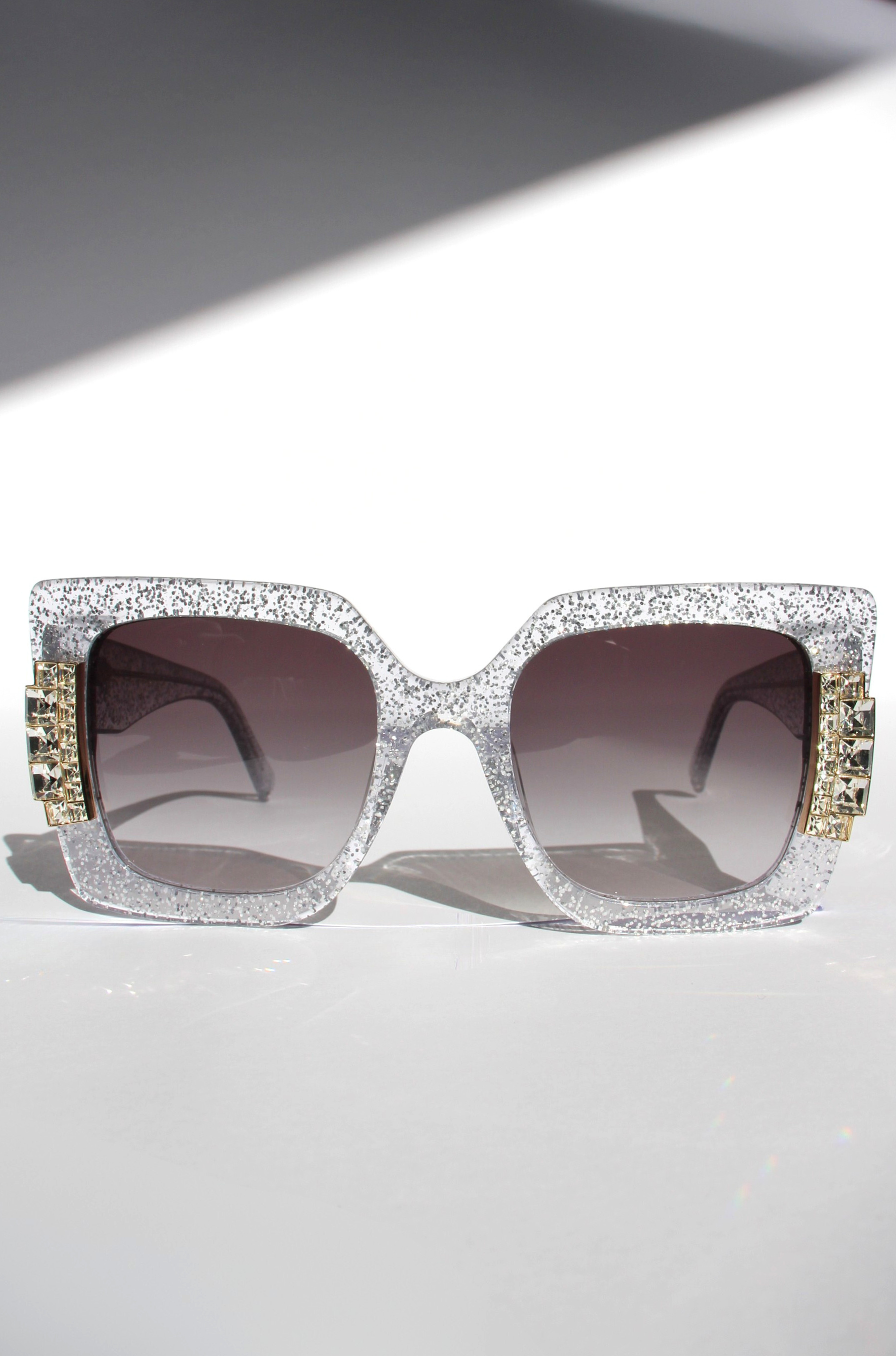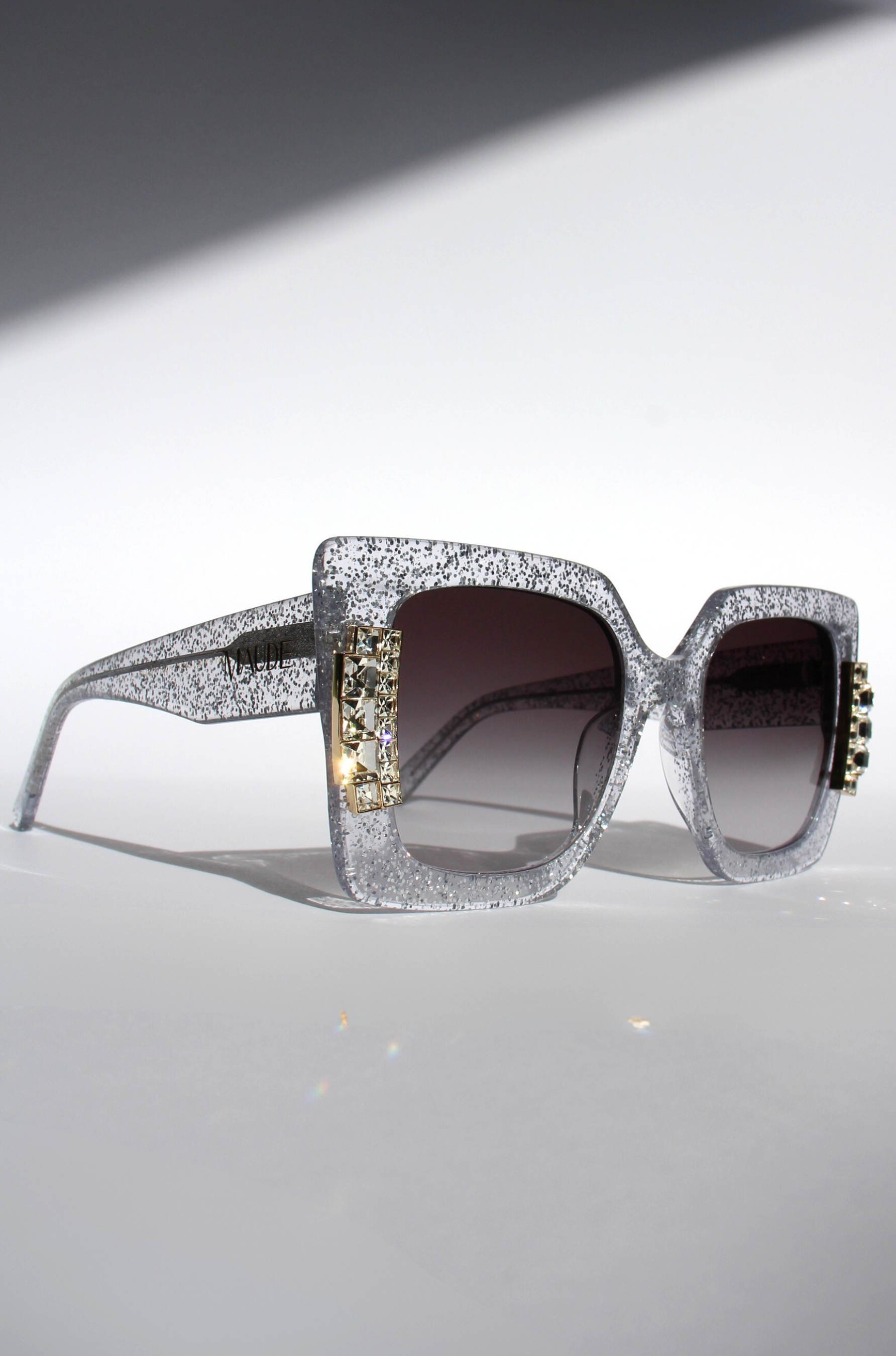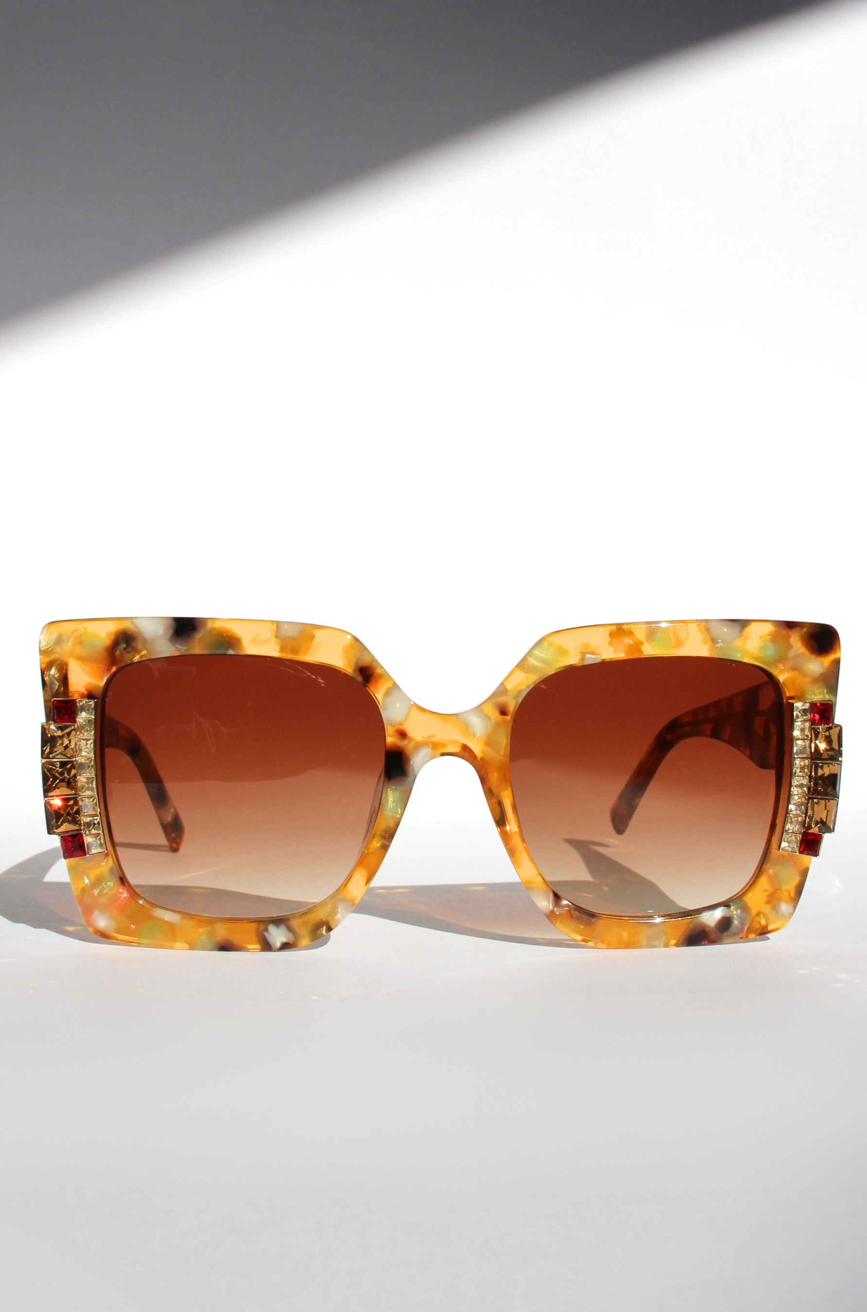 front view of multi-coloured cat-eye sunglasses with gradient brown lenses and gemstone embellishments on the frame corners, set against a white background