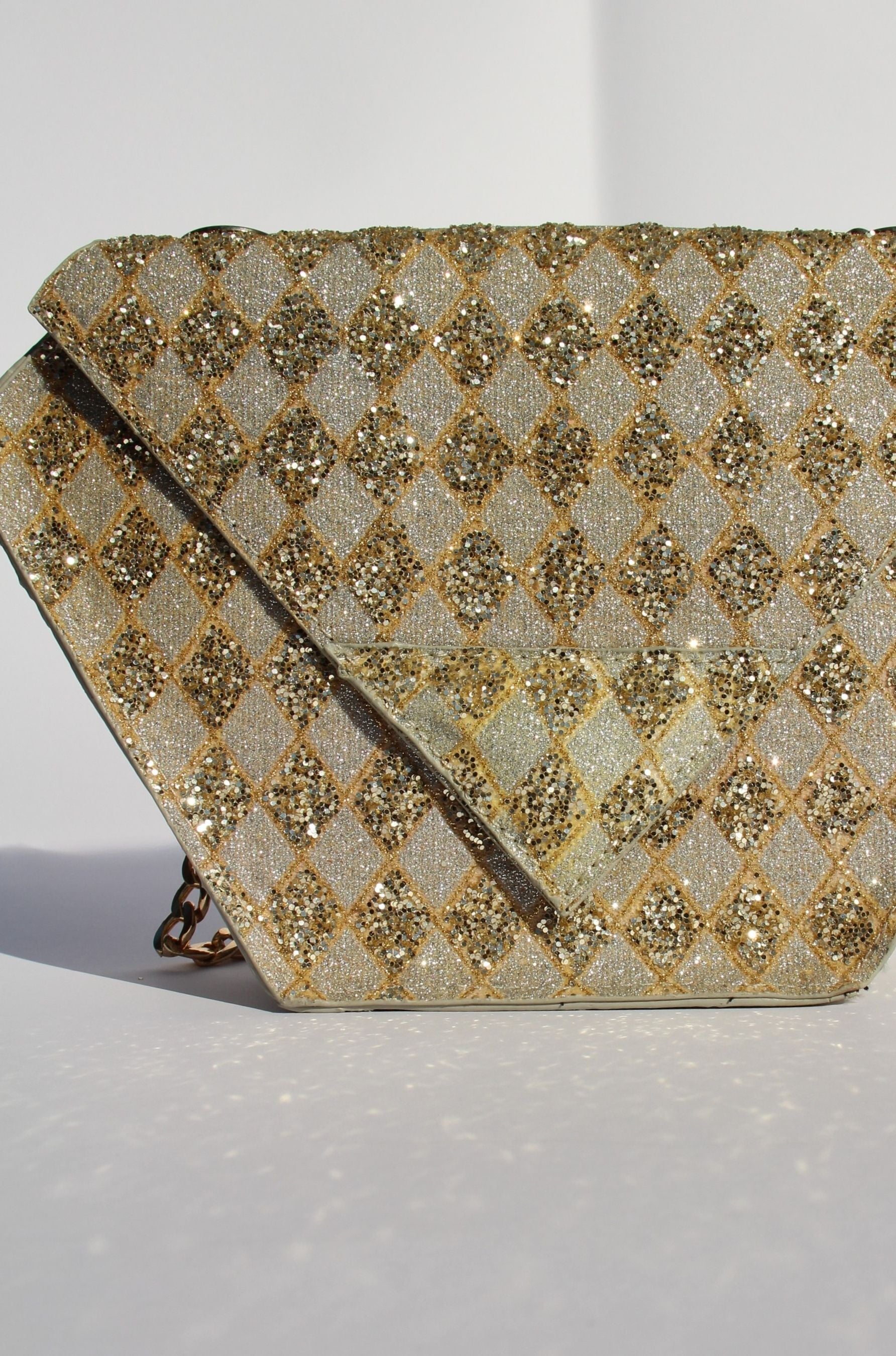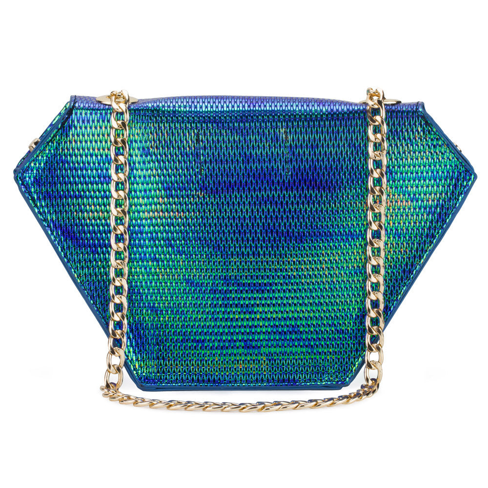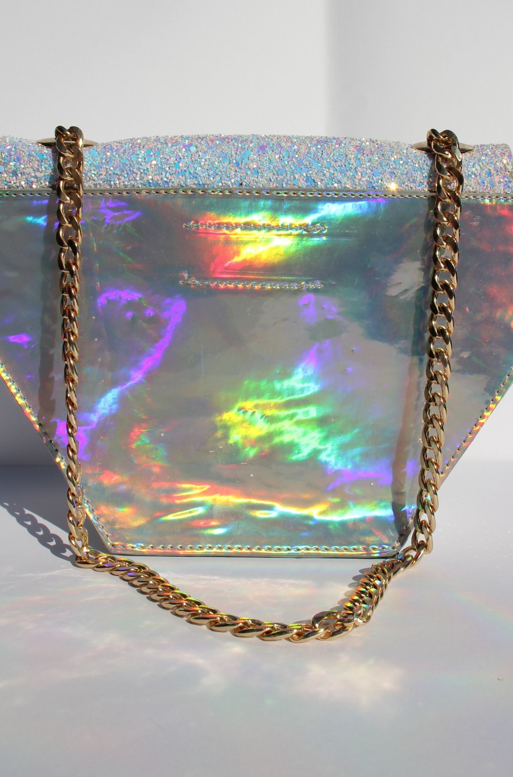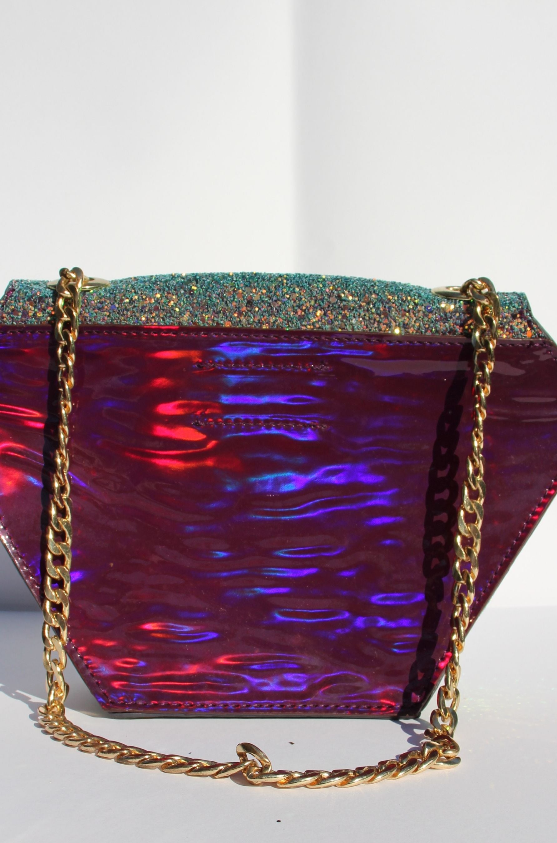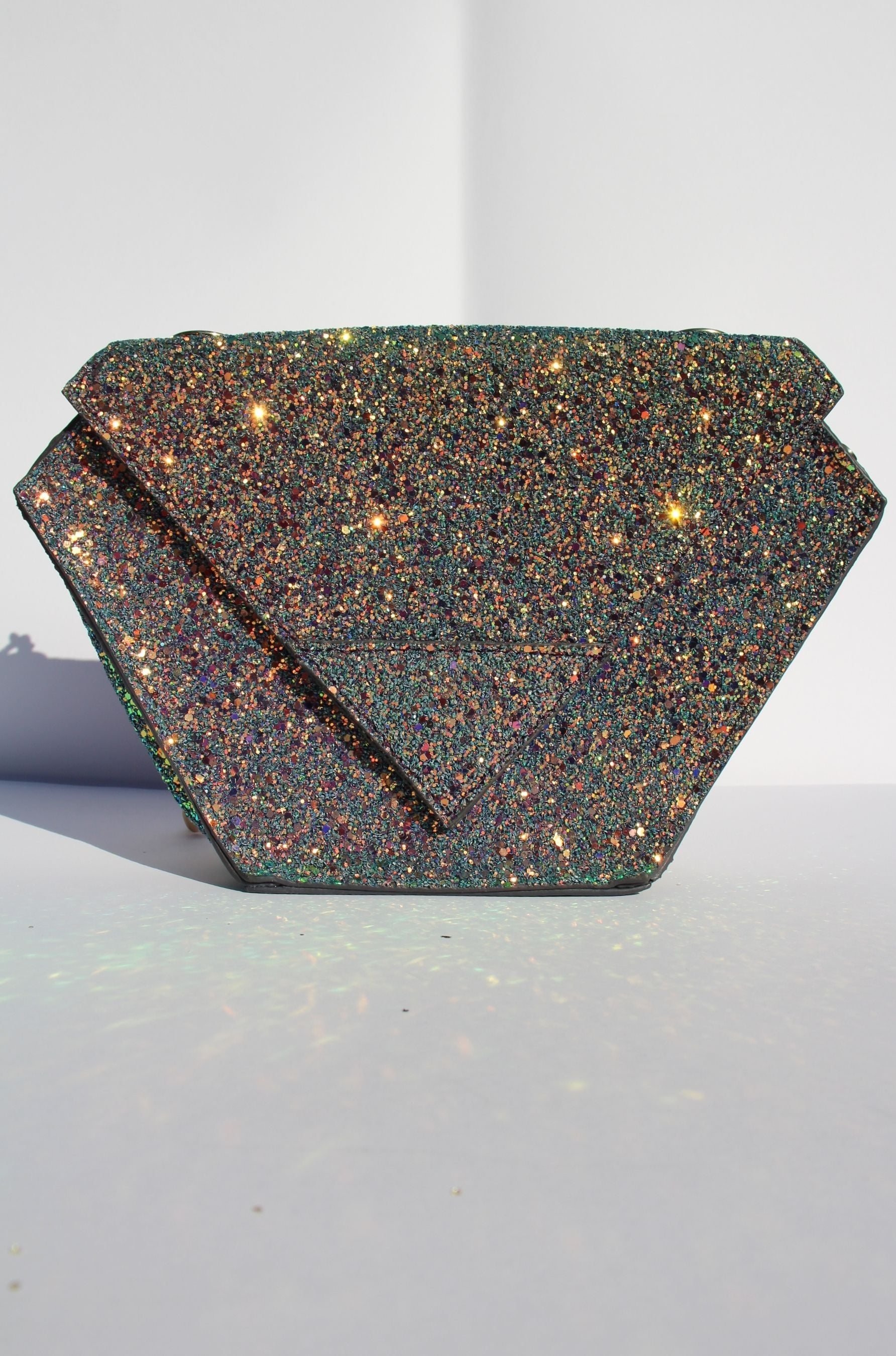 front view of multi-coloured cat-eye sunglasses with gradient brown lenses and gemstone embellishments on the frame corners, set against a white background