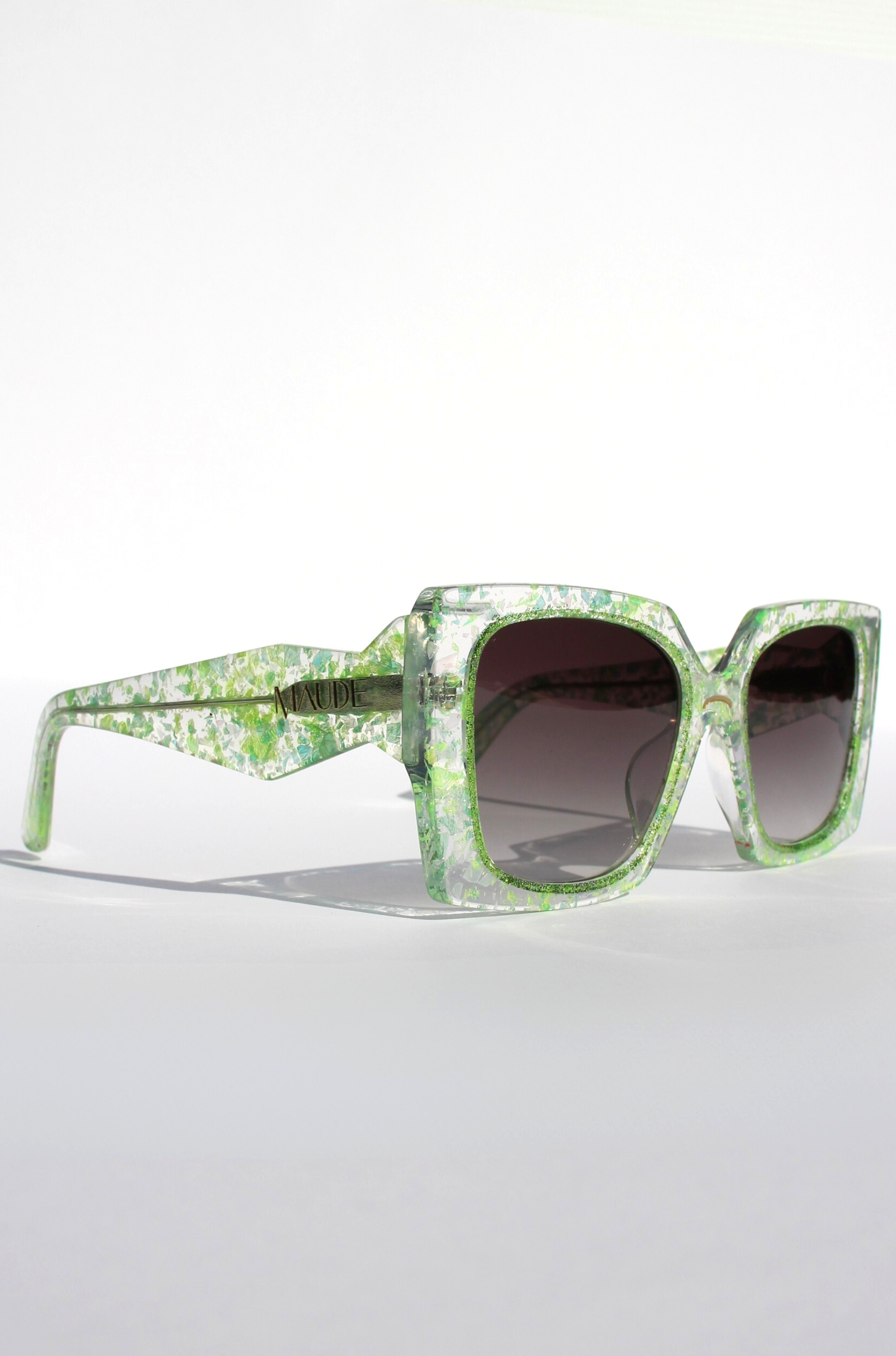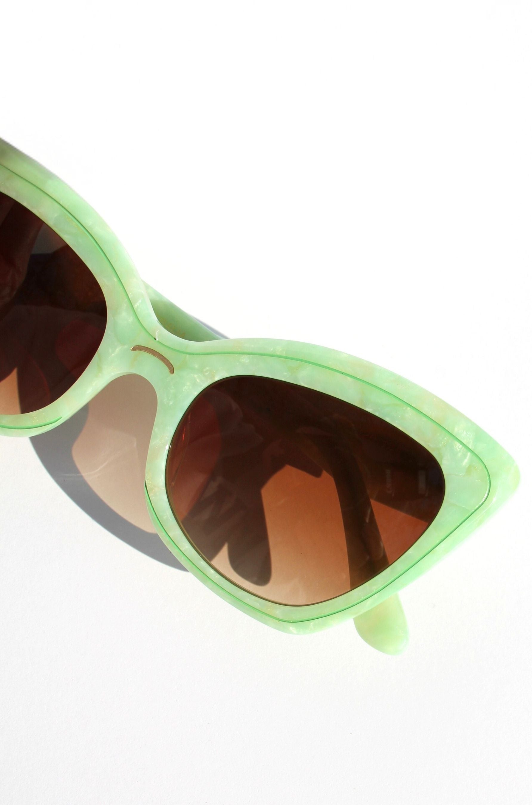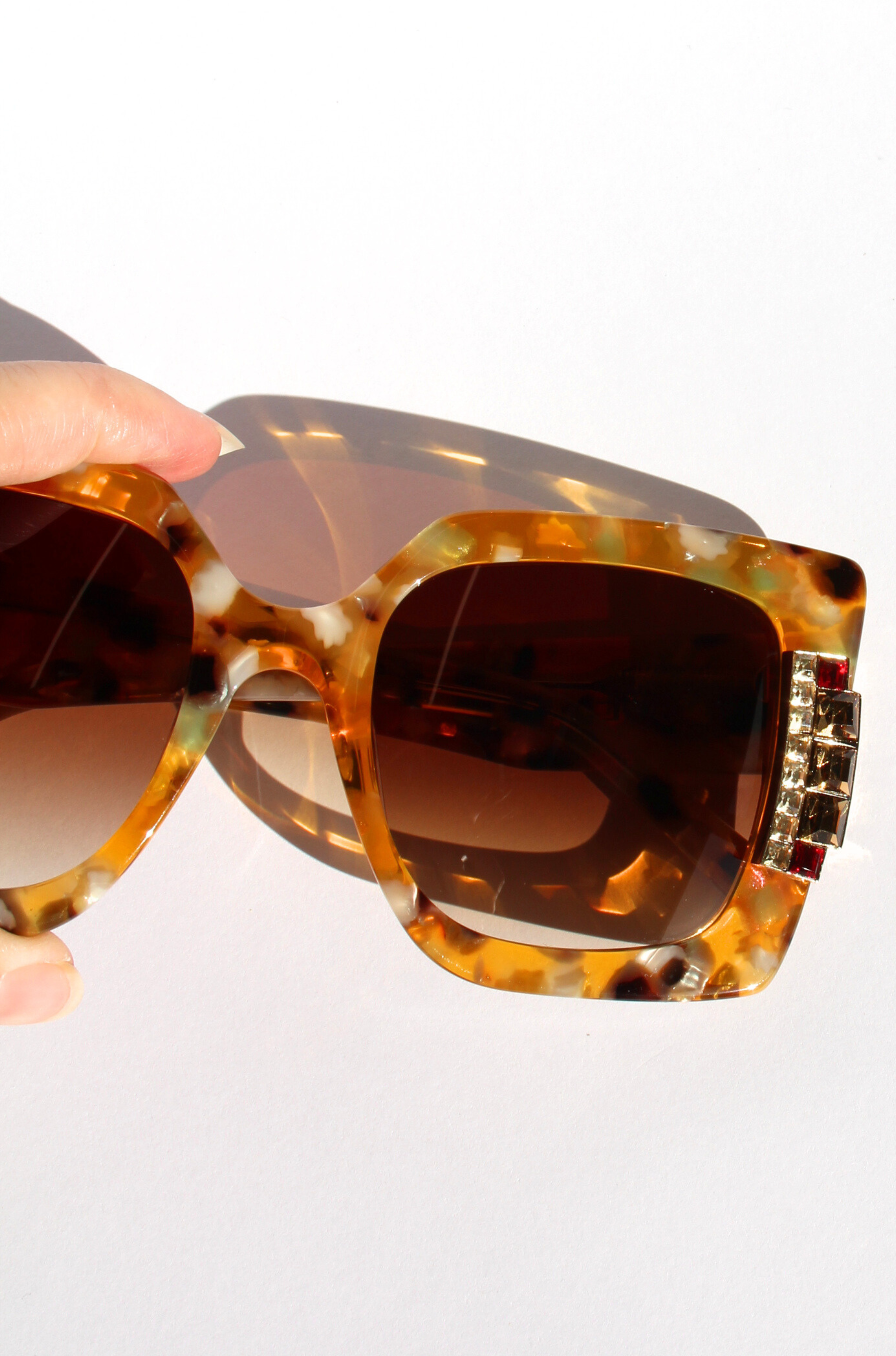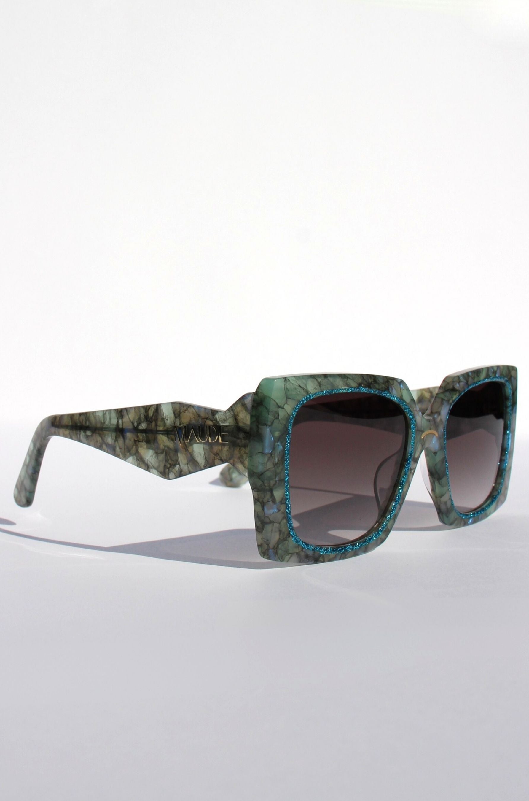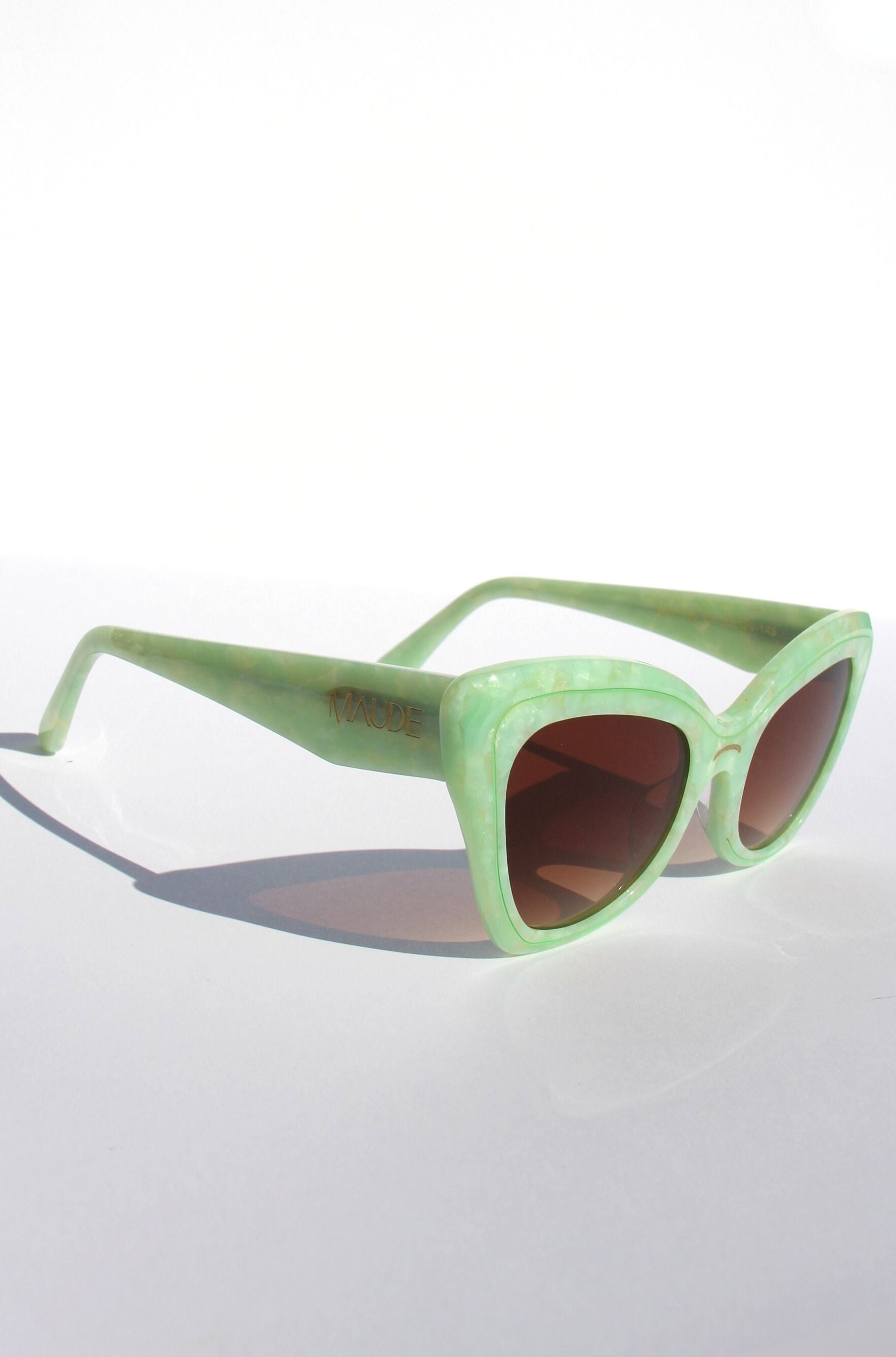 side view of a pair of stylish sunglasses in a green tortoise shell style displaced against a white back drop. the lenses are a gradient brown. You can see an embellished 'M' on the side of the frame arm