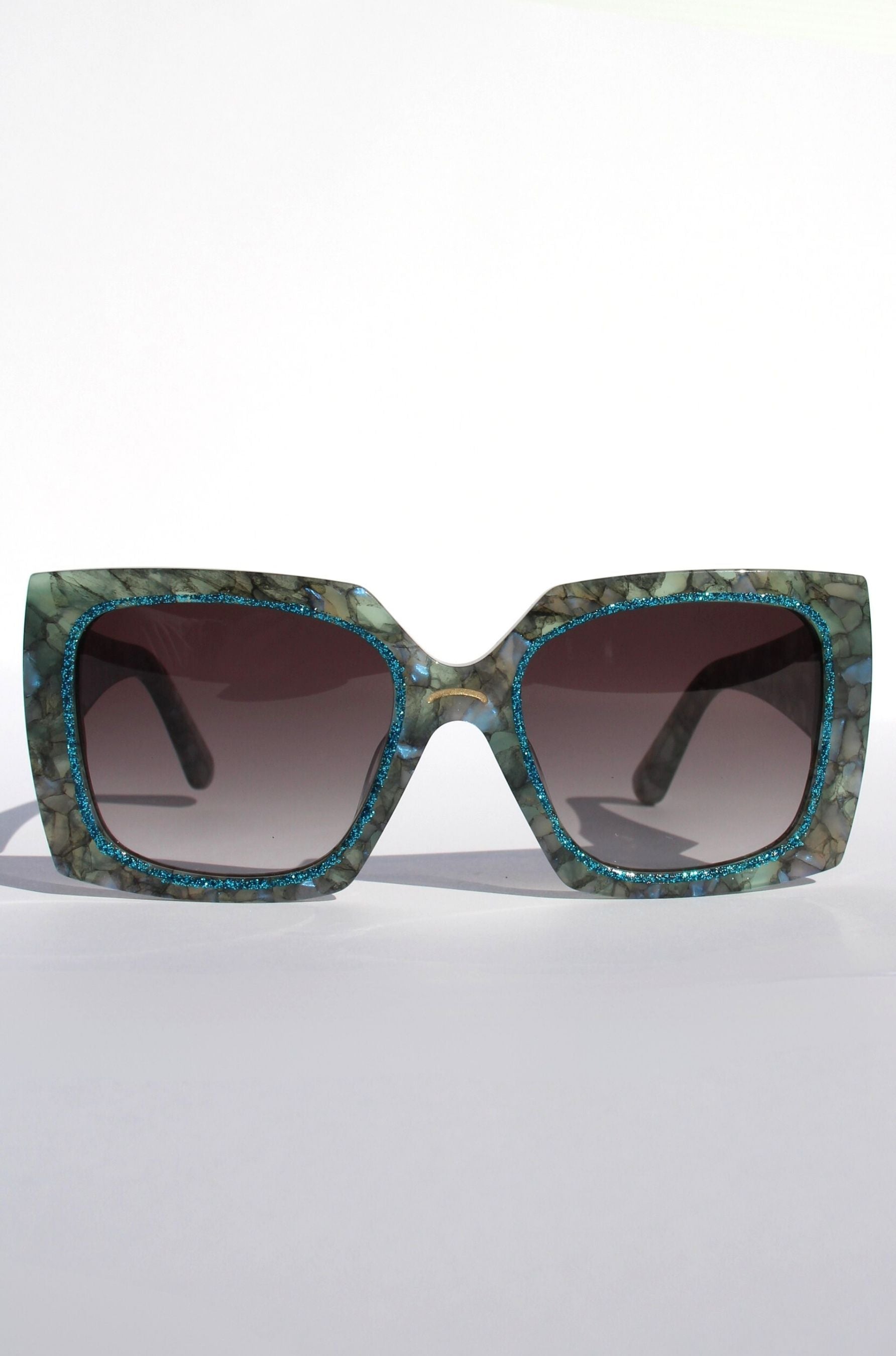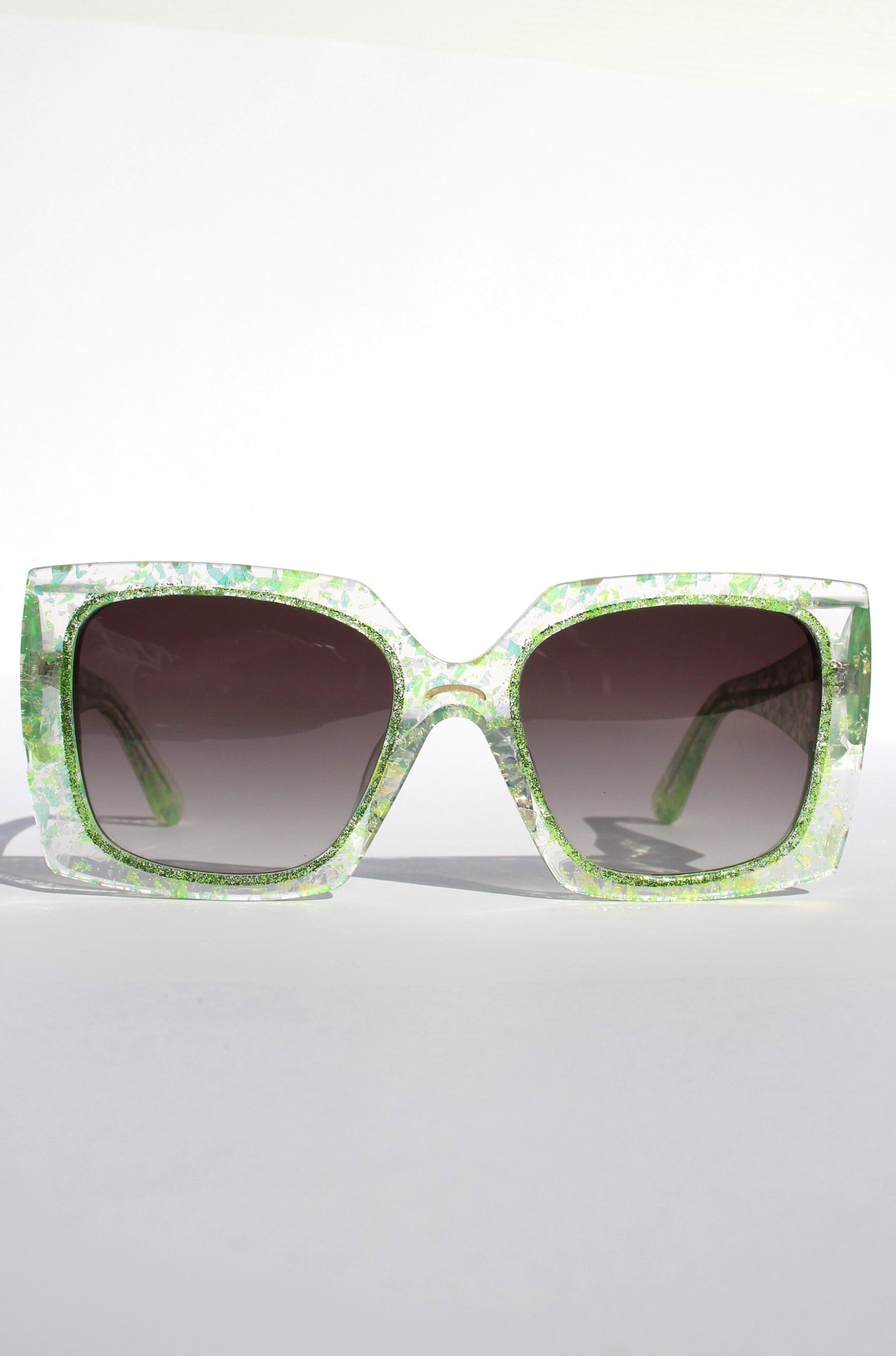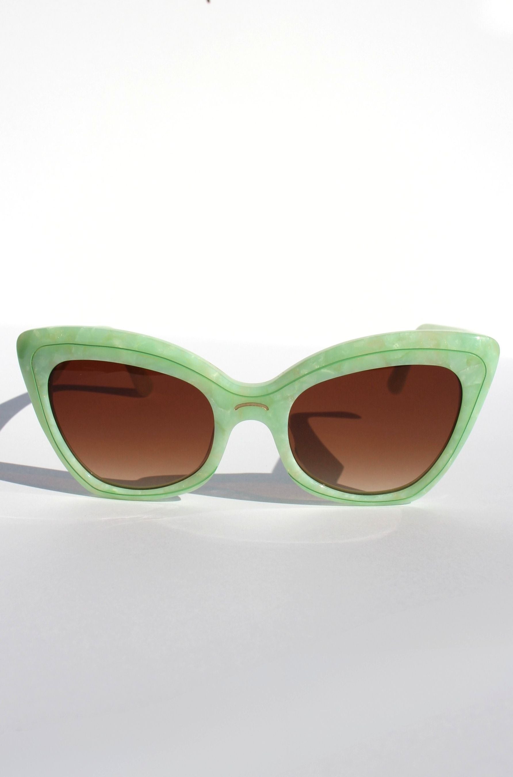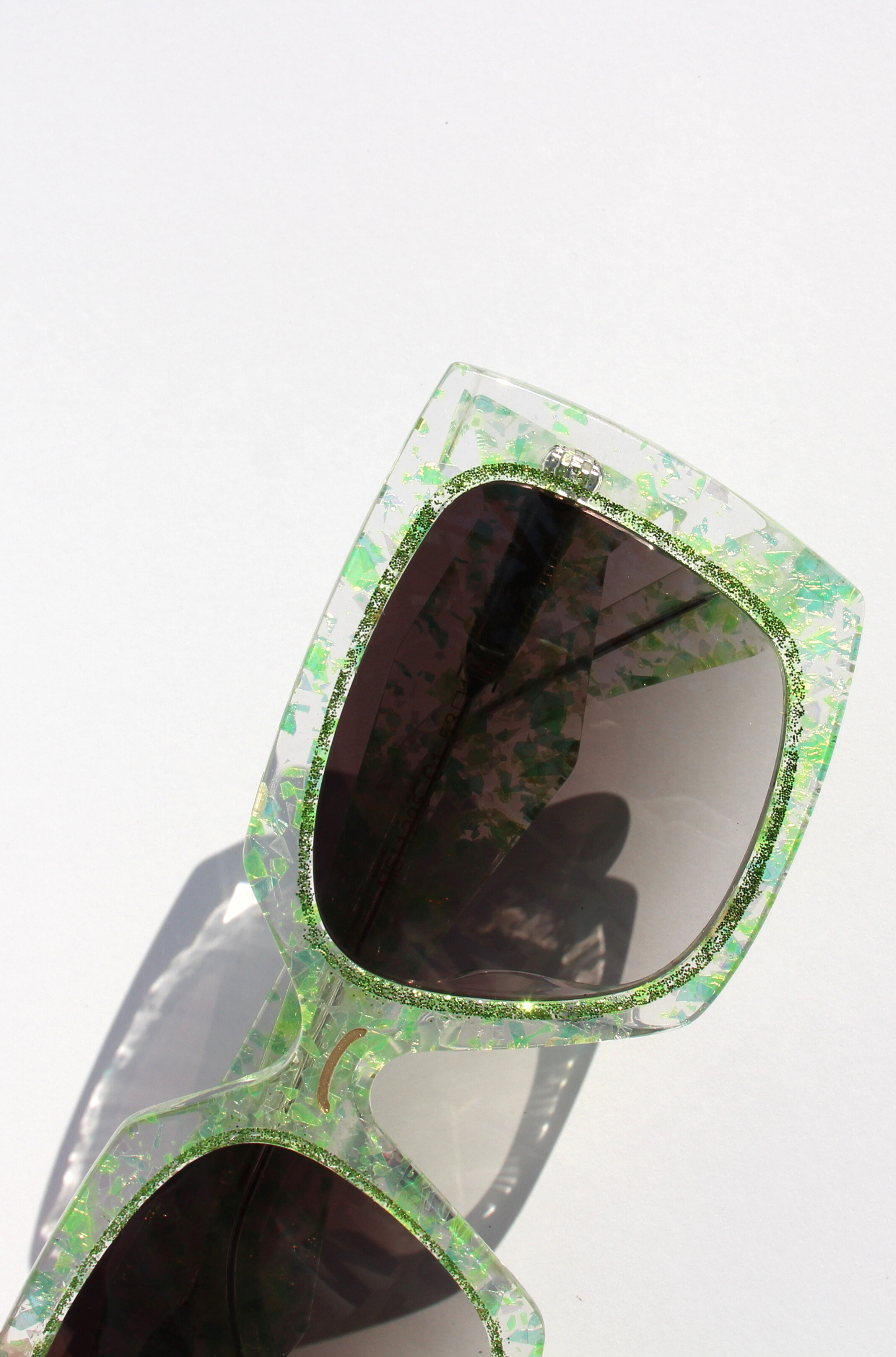 side view of a pair of stylish sunglasses in a green tortoise shell style displaced against a white back drop. the lenses are a gradient brown. You can see an embellished 'M' on the side of the frame arm