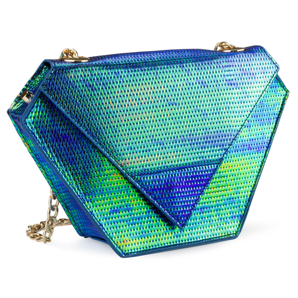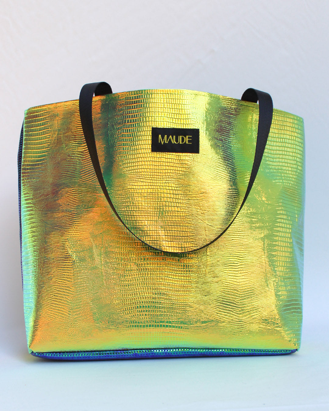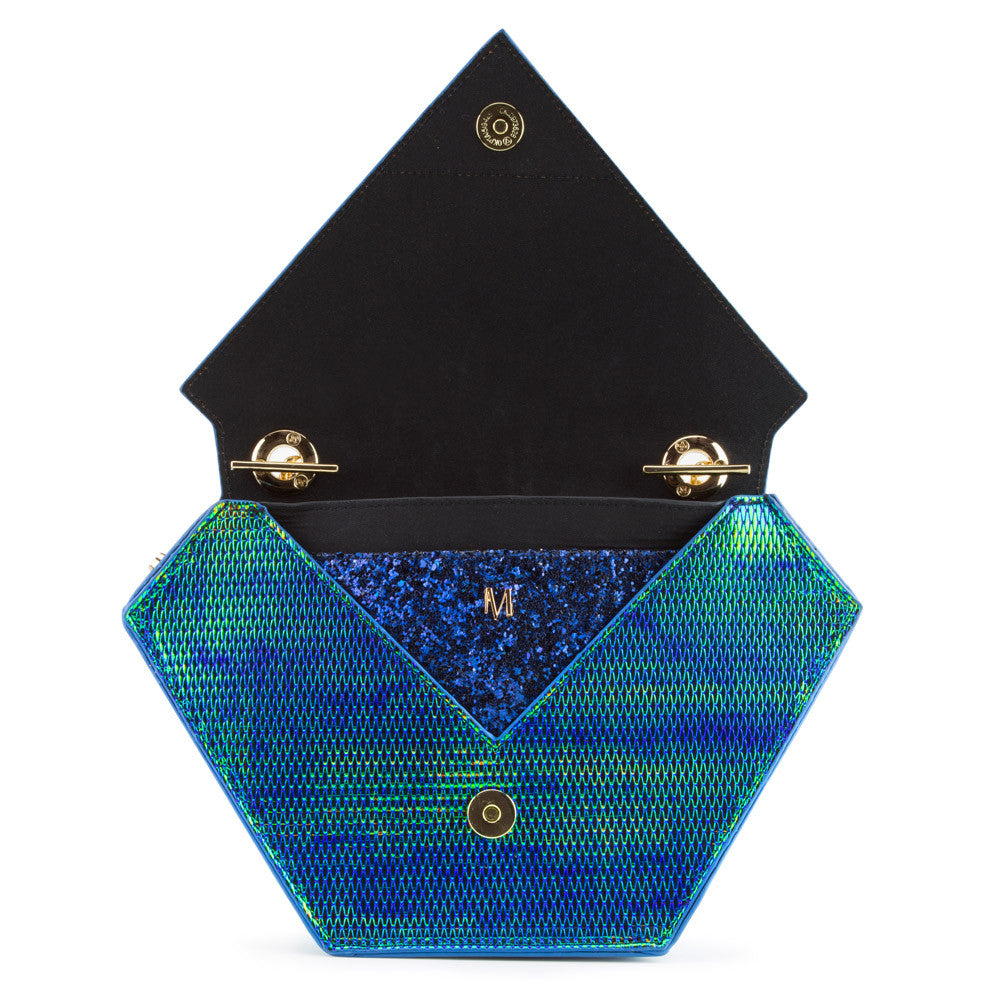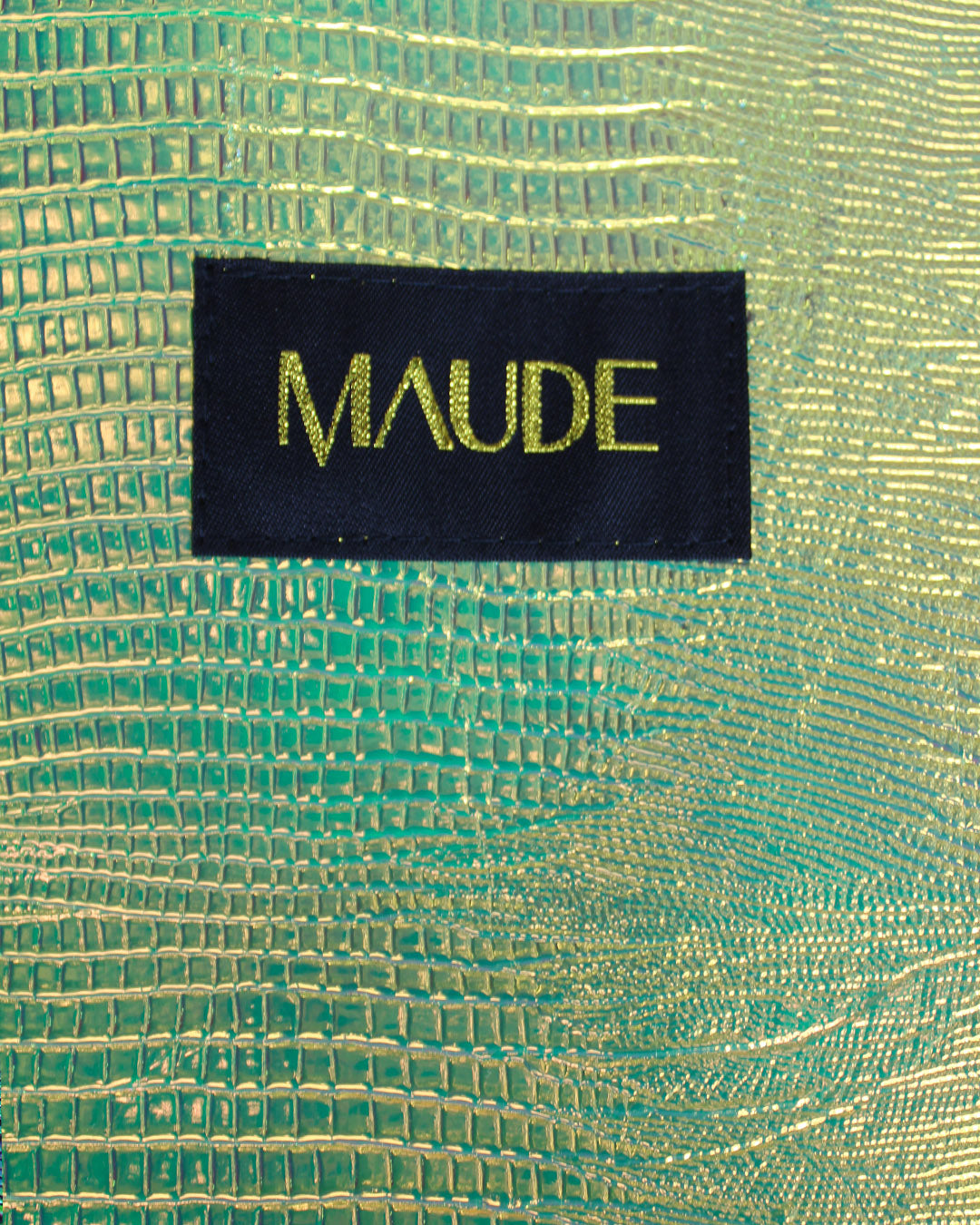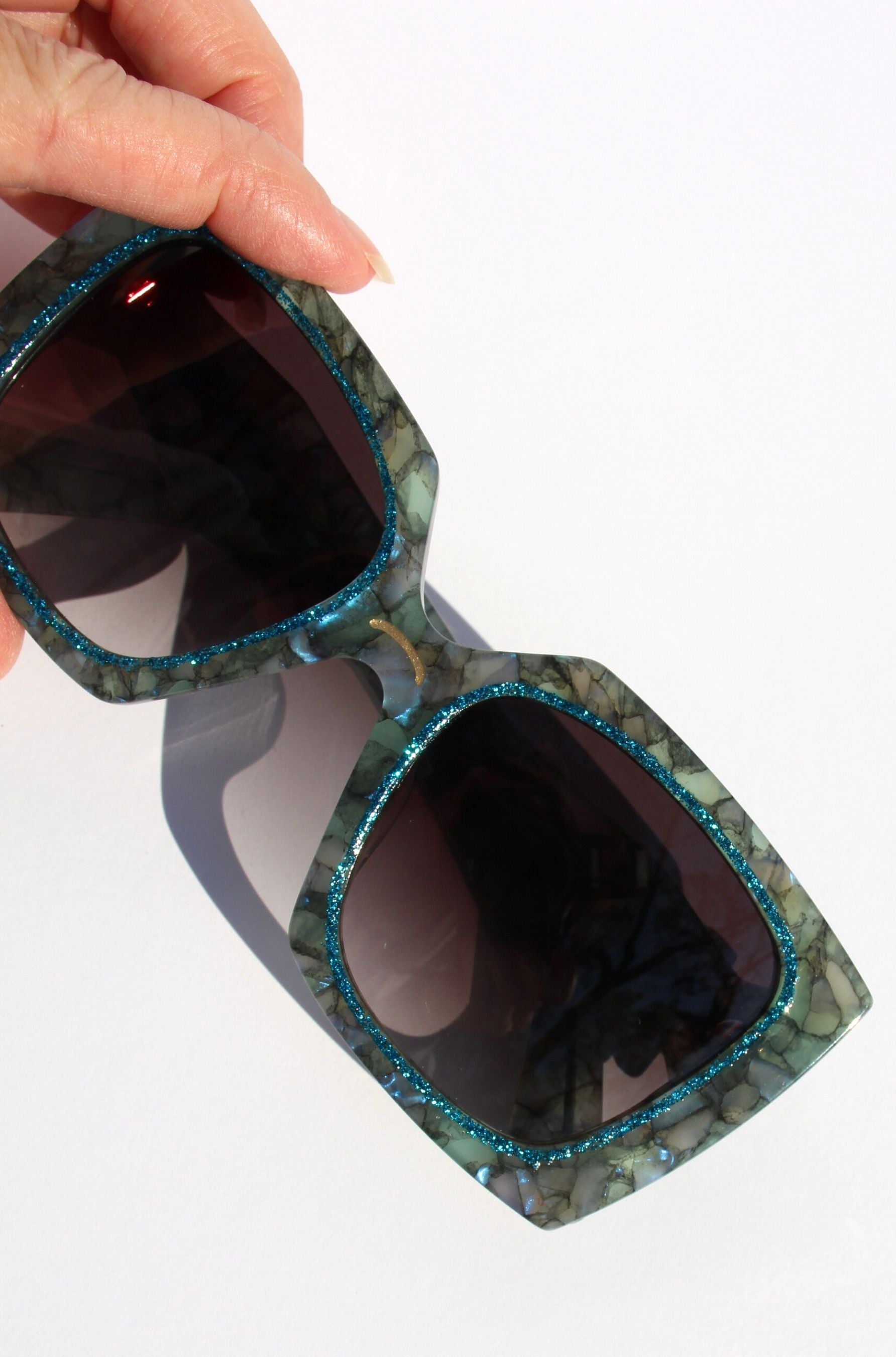 side view of a pair of stylish sunglasses in a green tortoise shell style displaced against a white back drop. the lenses are a gradient brown. You can see an embellished 'M' on the side of the frame arm