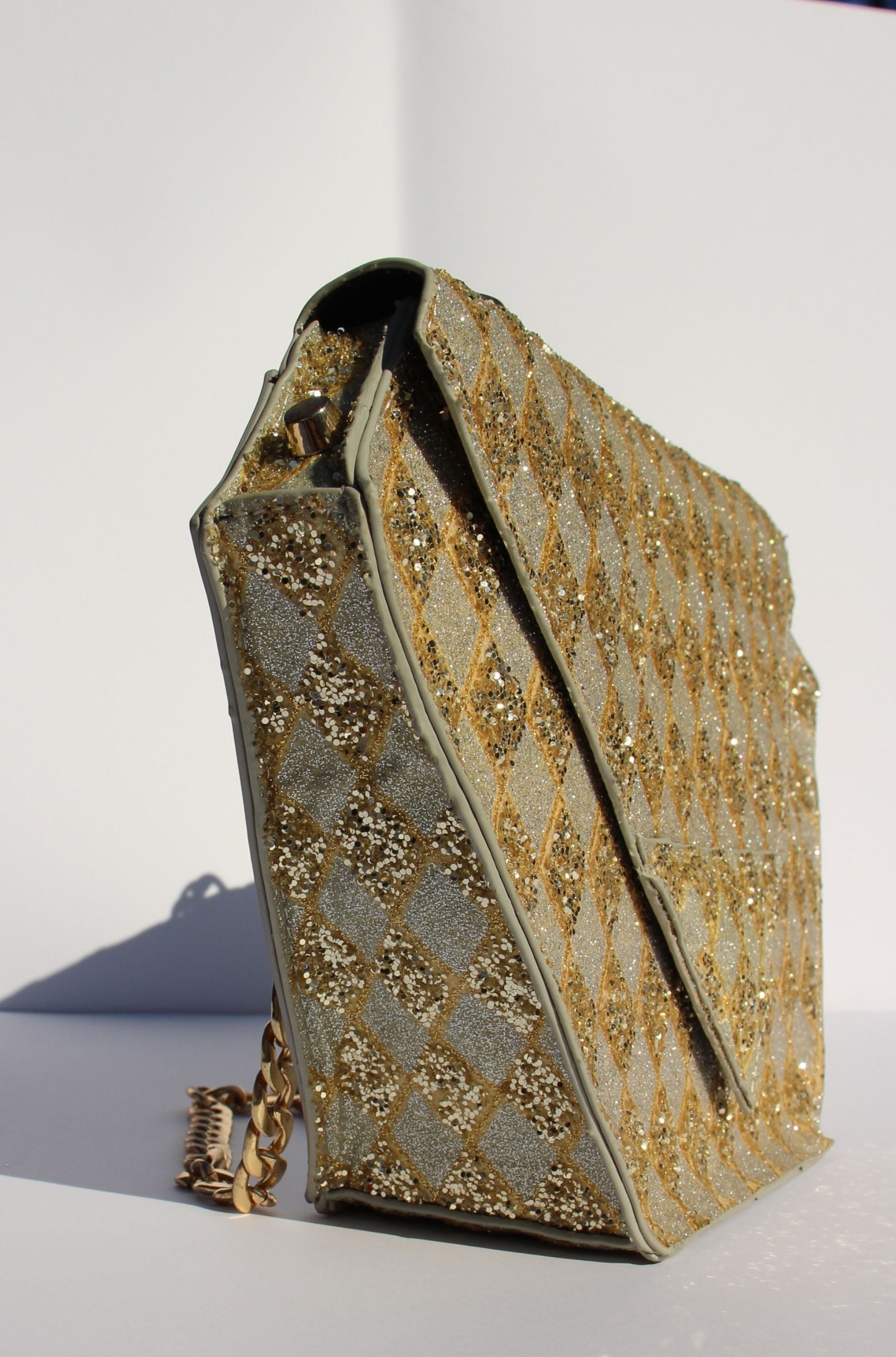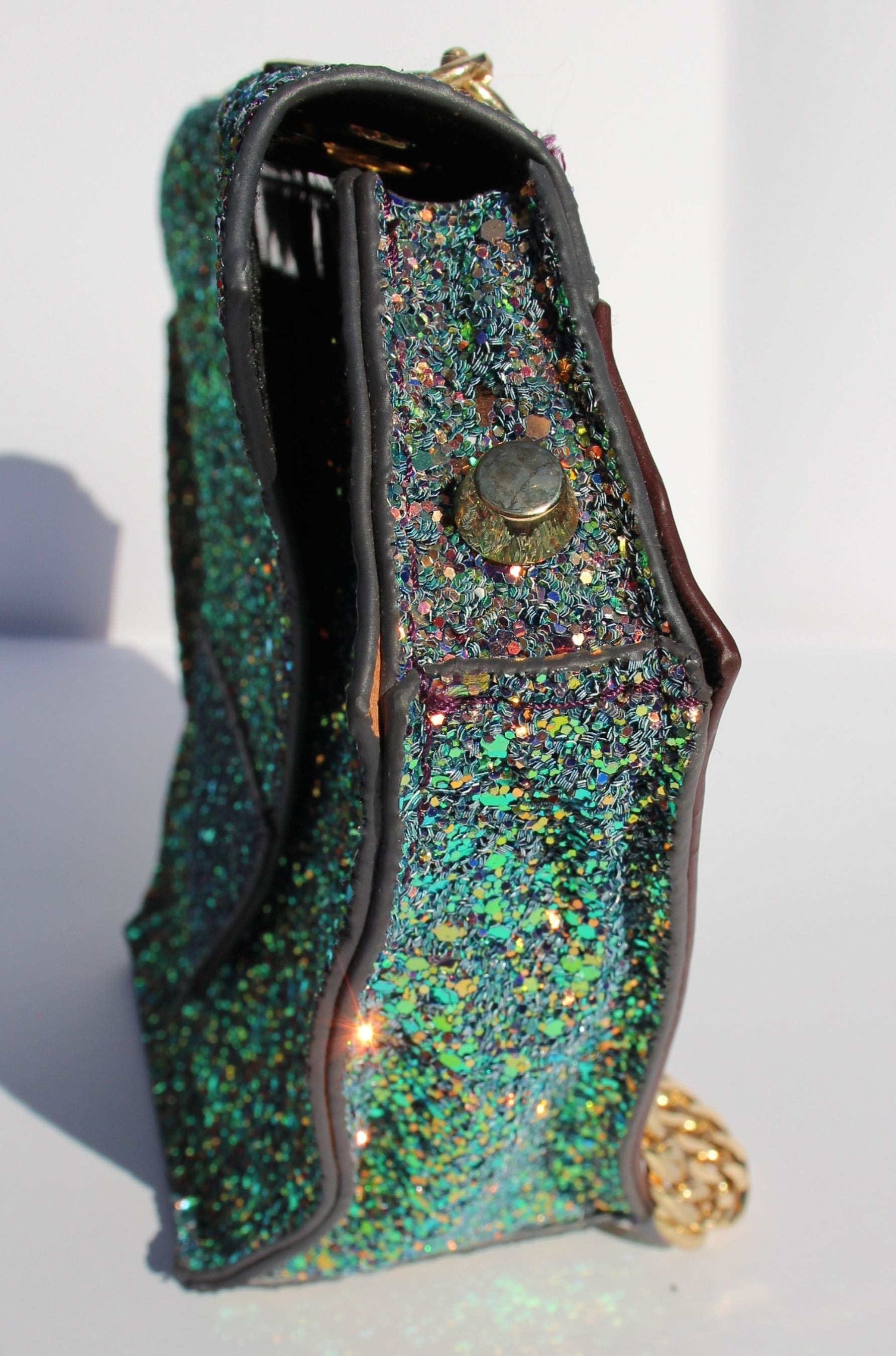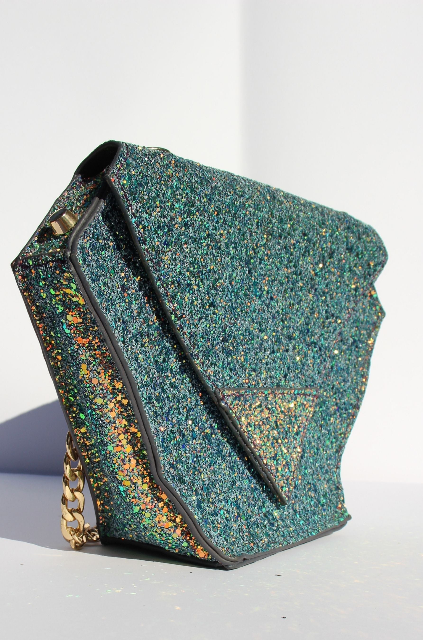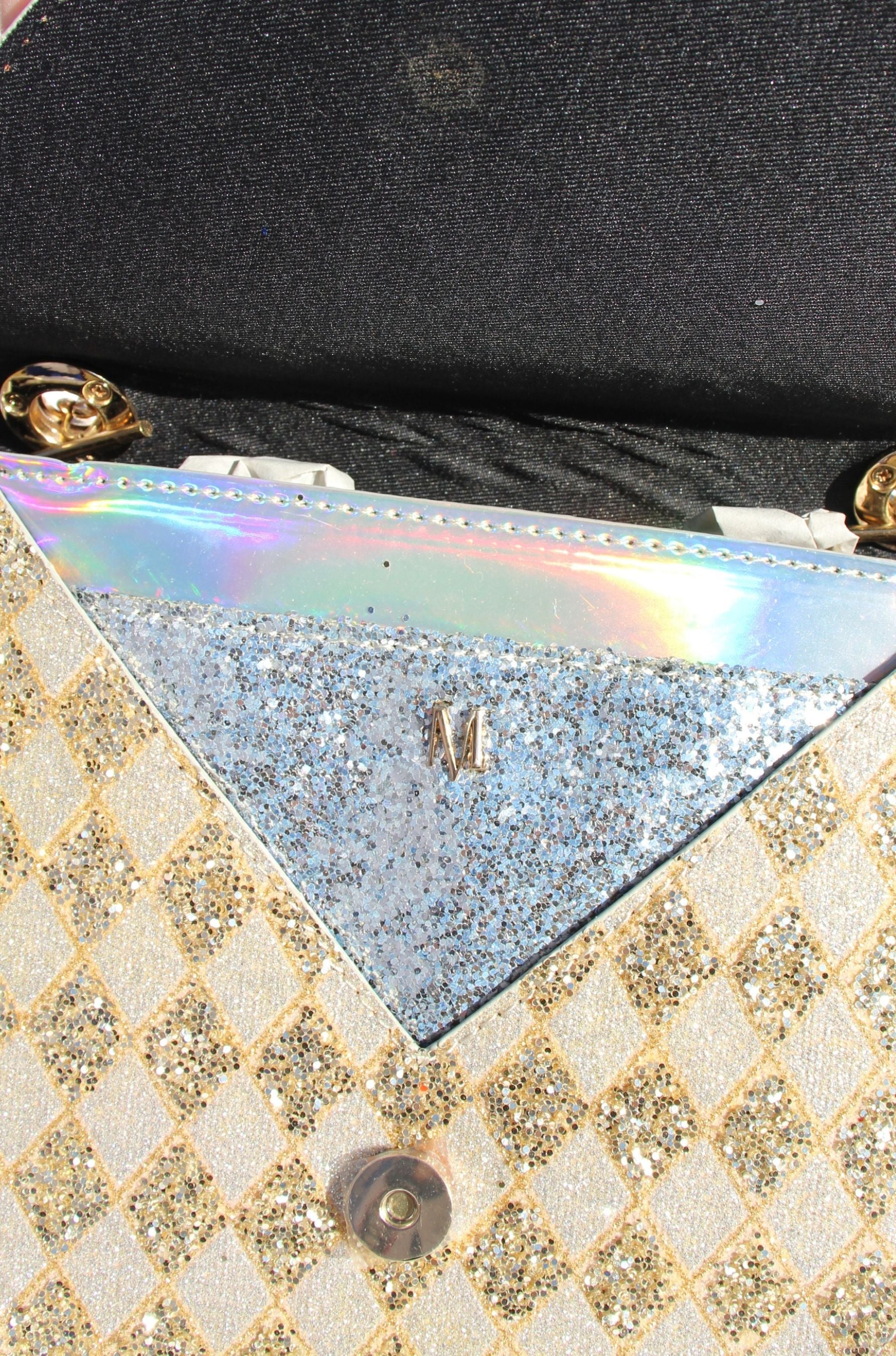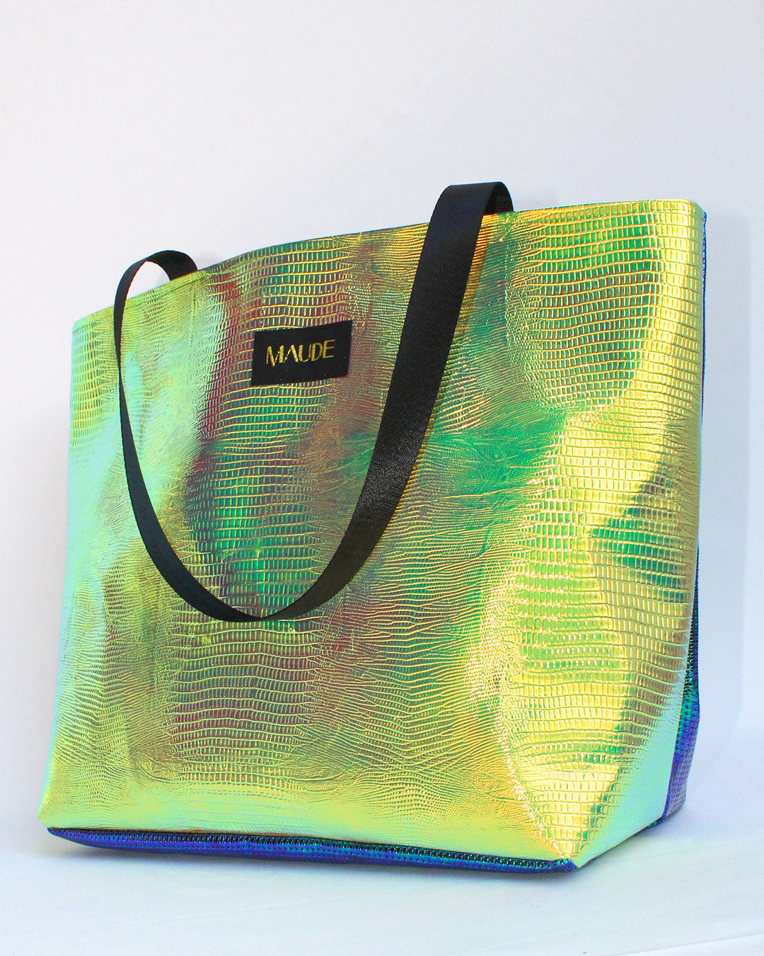 side view of a pair of stylish sunglasses in a green tortoise shell style displaced against a white back drop. the lenses are a gradient brown. You can see an embellished 'M' on the side of the frame arm