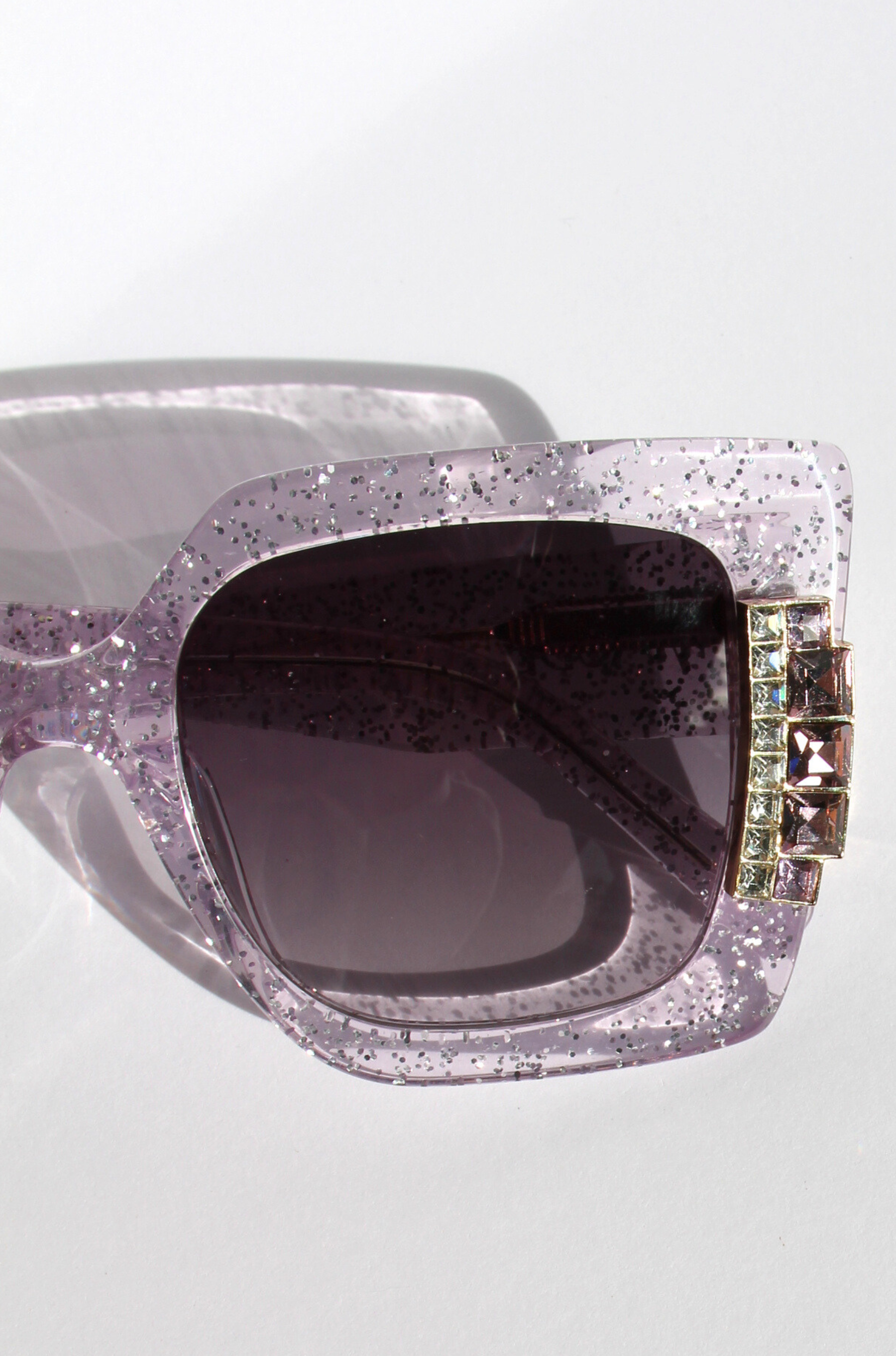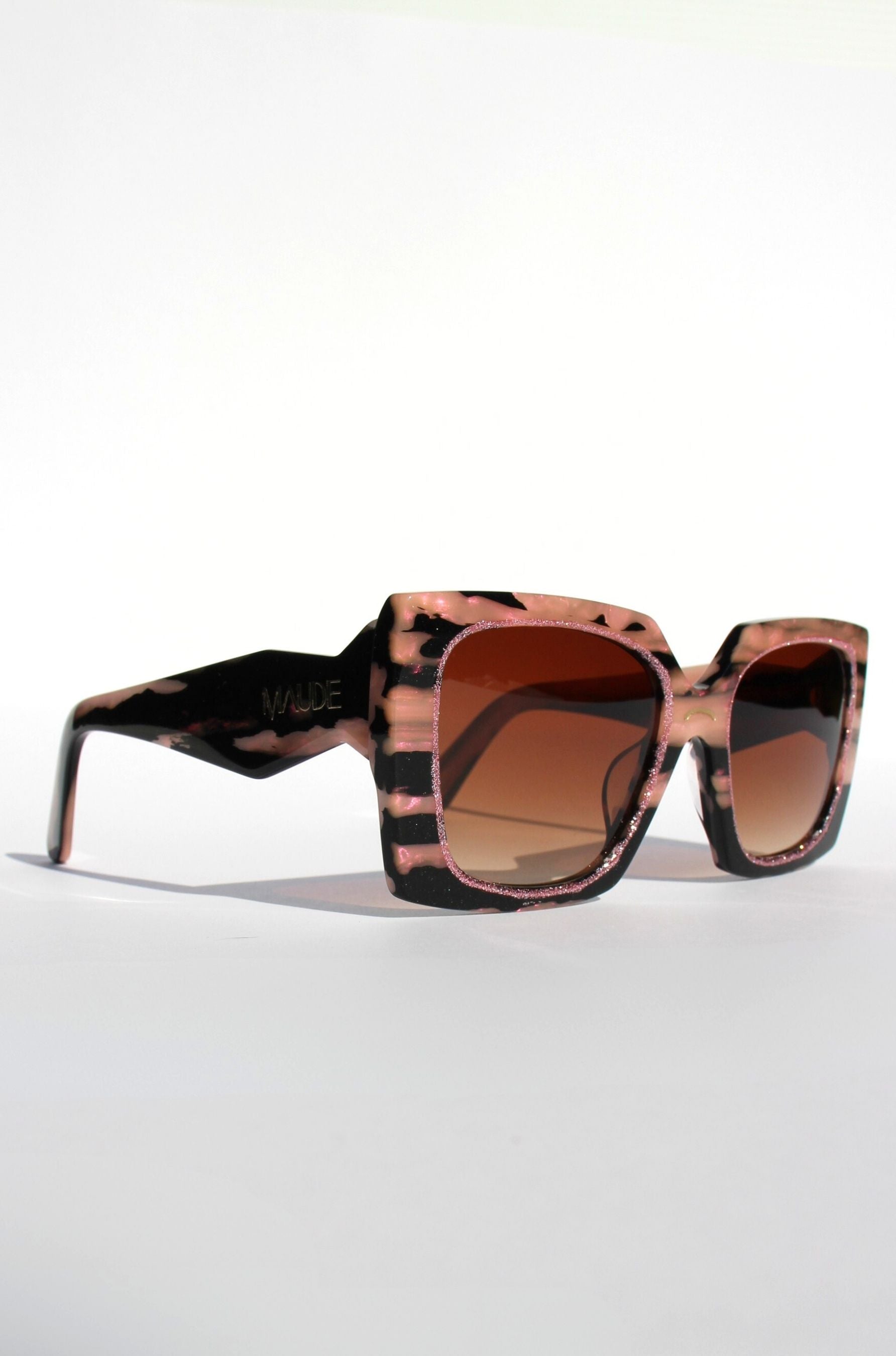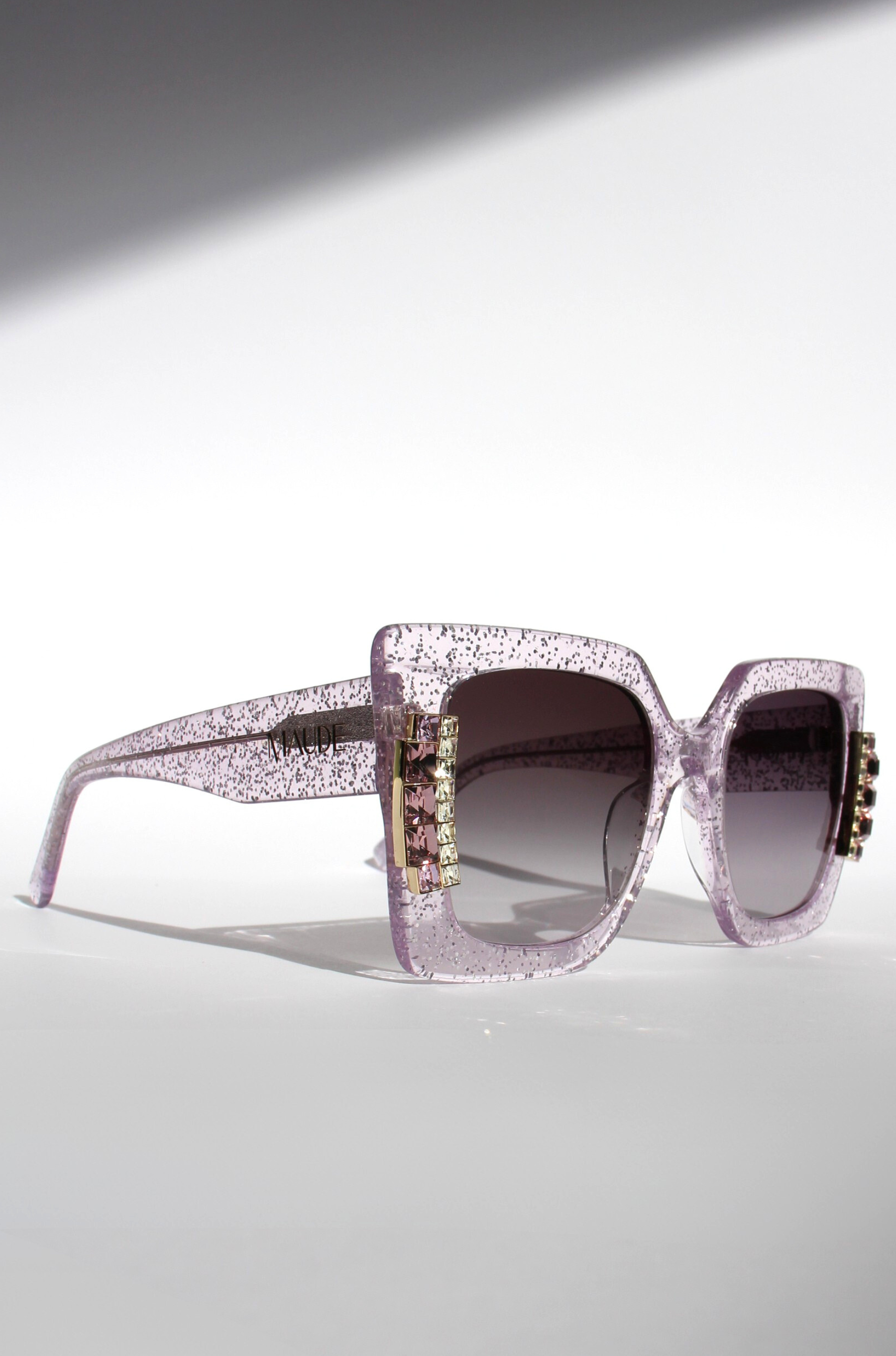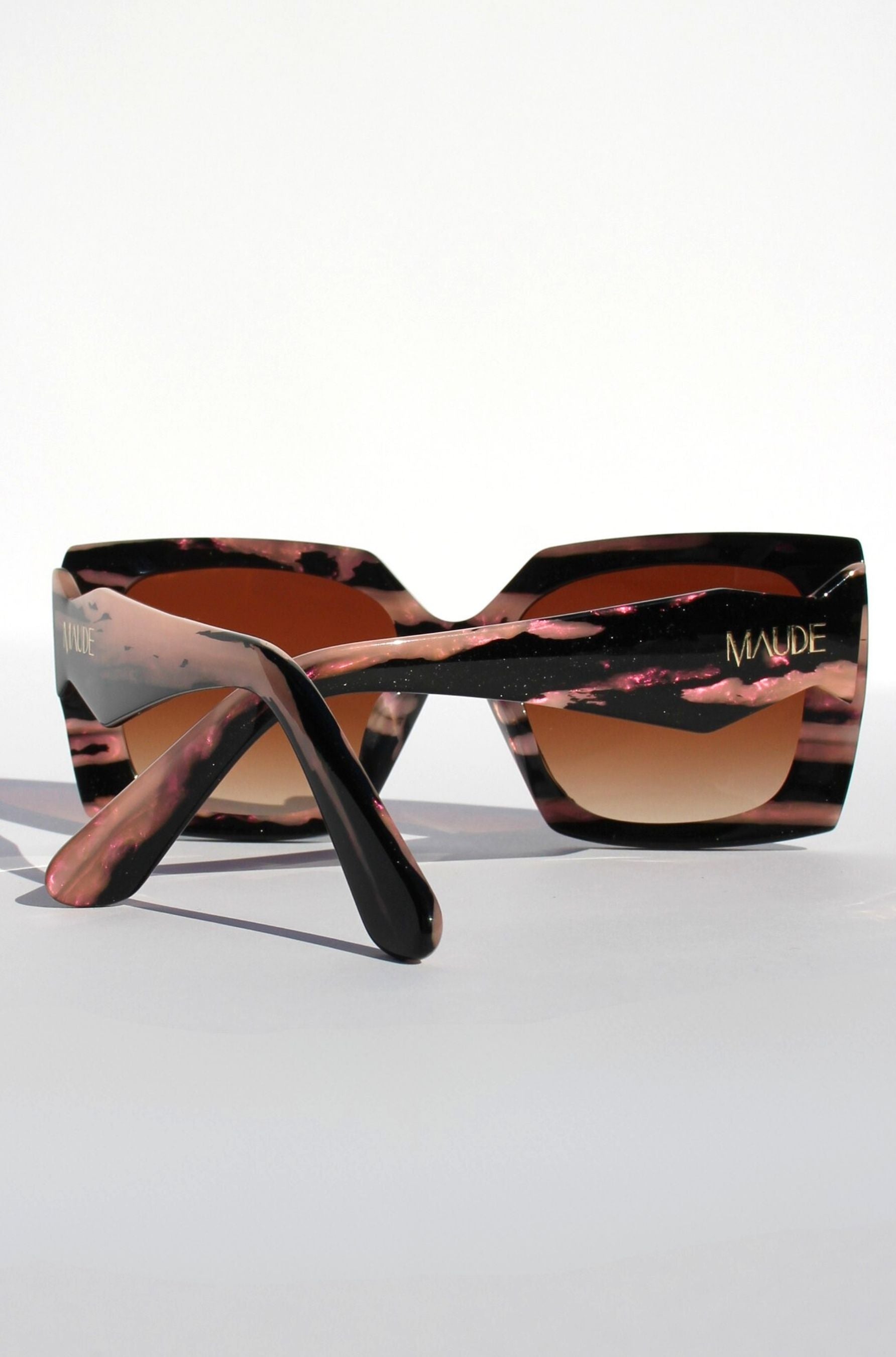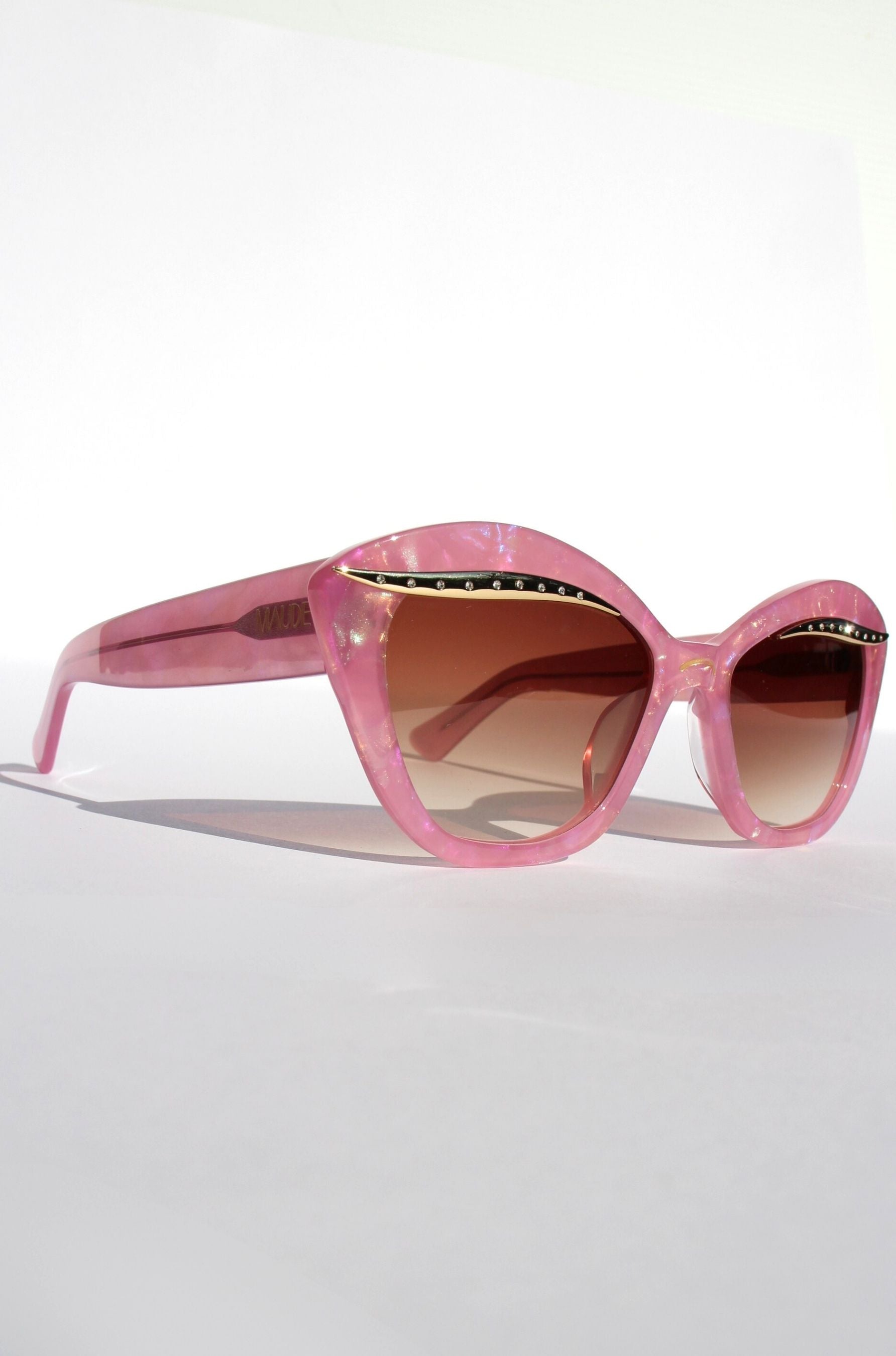 Side view of stylish pair of pastel pink and lilac sunglasses with a brown gradient lense set against a white background. there is a gold 'M' on the arm of the frame.