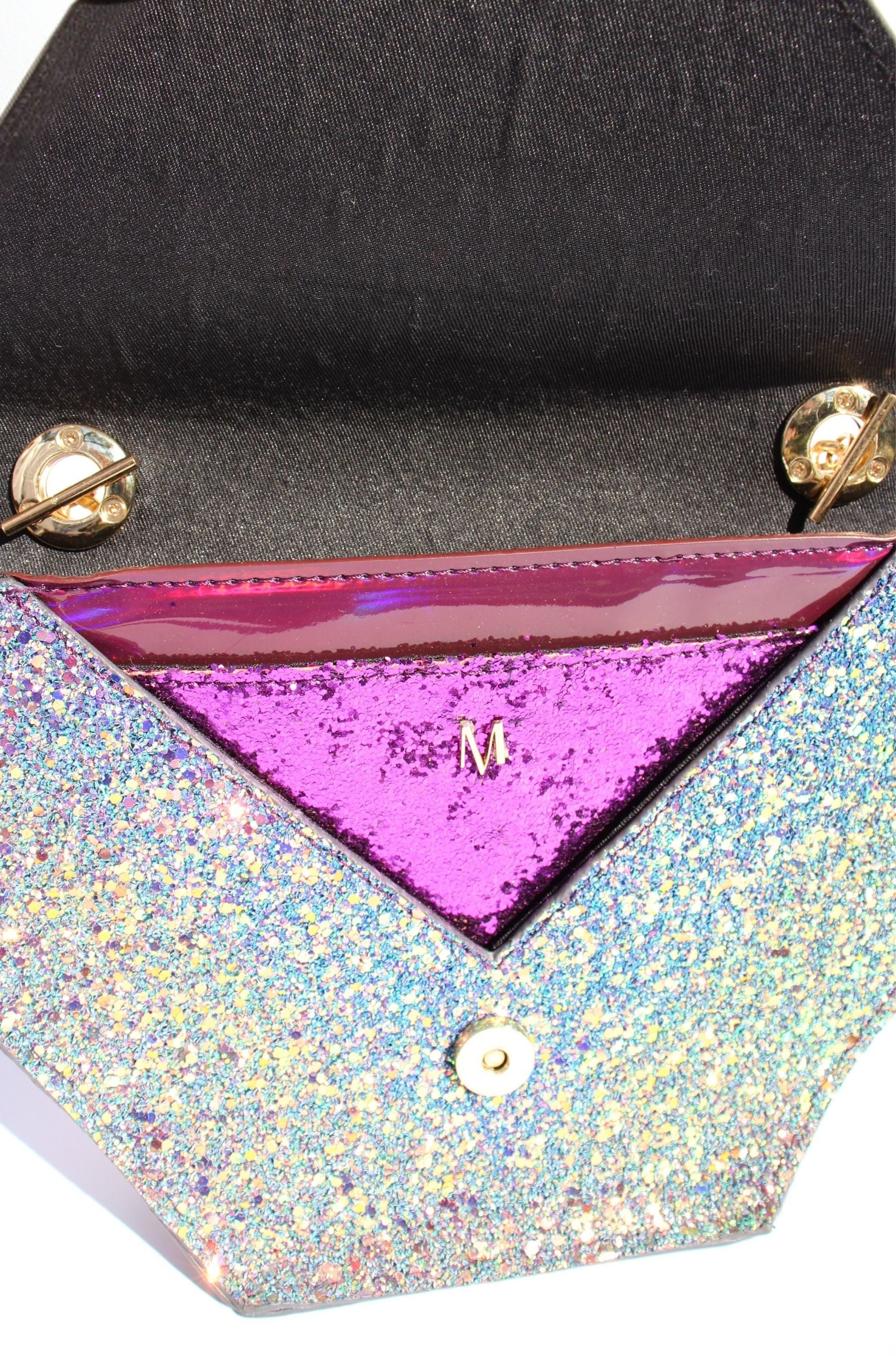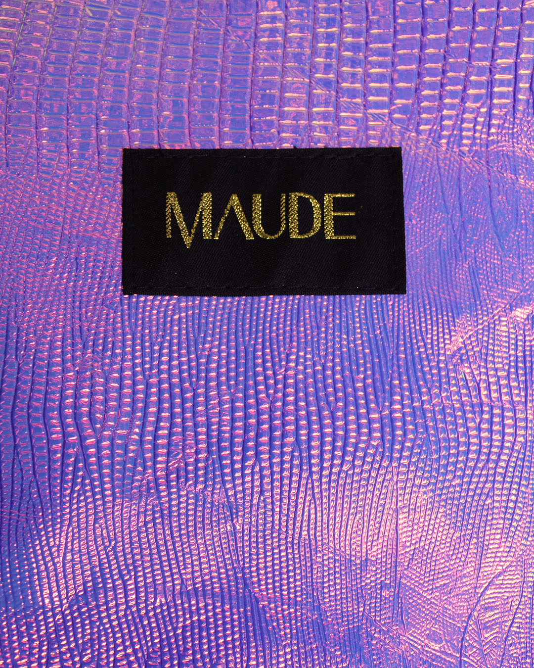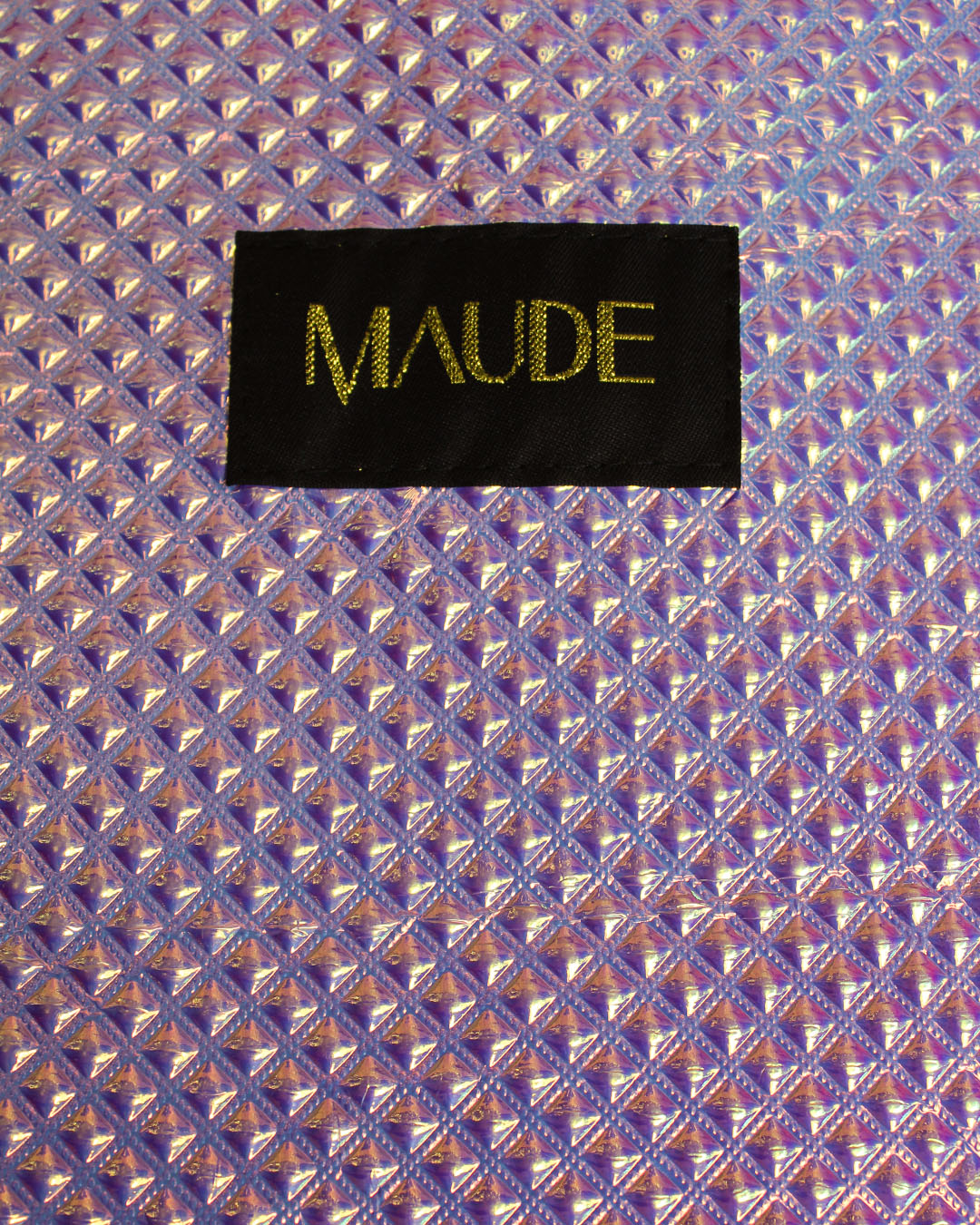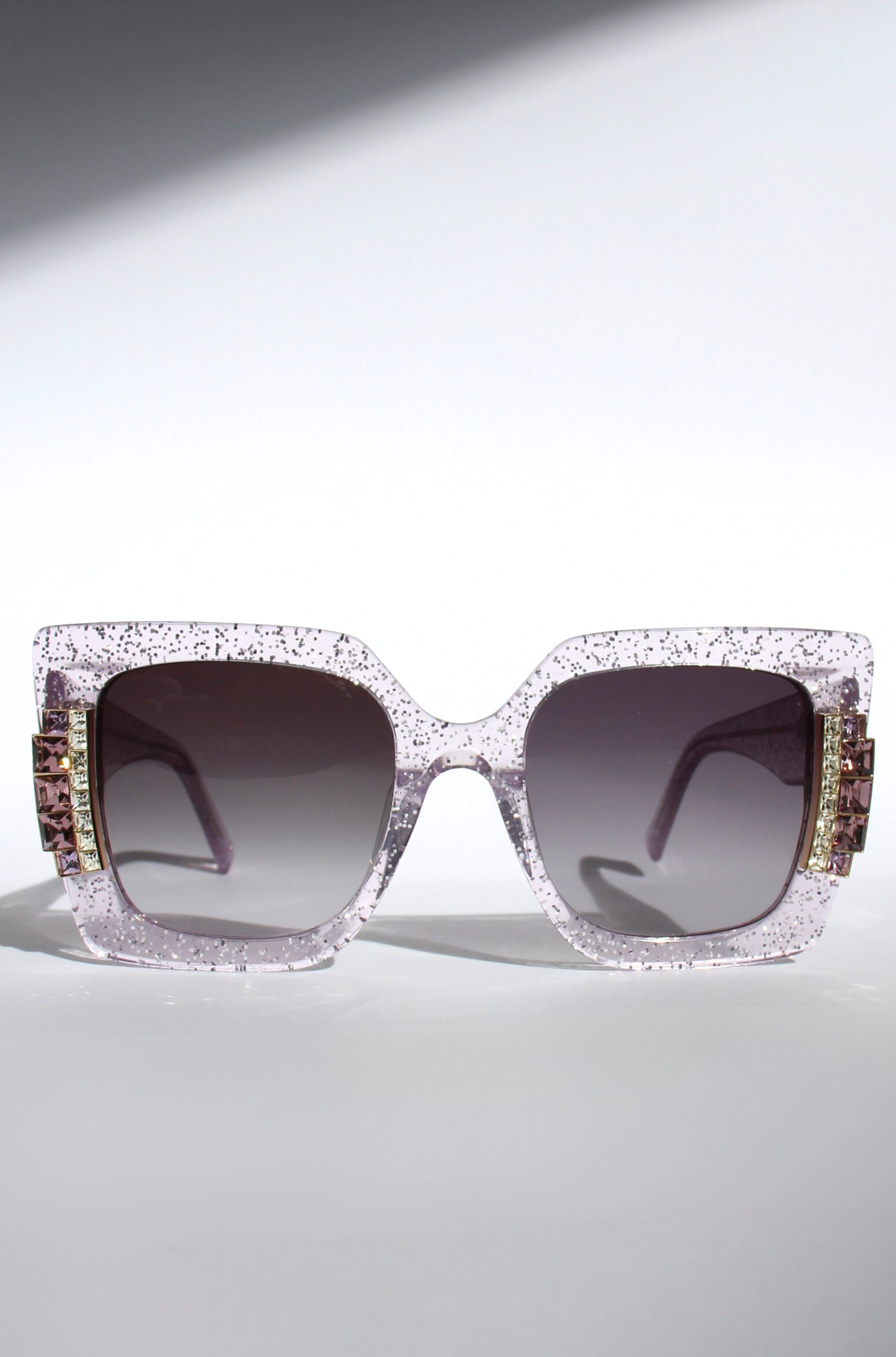 Side view of stylish pair of pastel pink and lilac sunglasses with a brown gradient lense set against a white background. there is a gold 'M' on the arm of the frame.