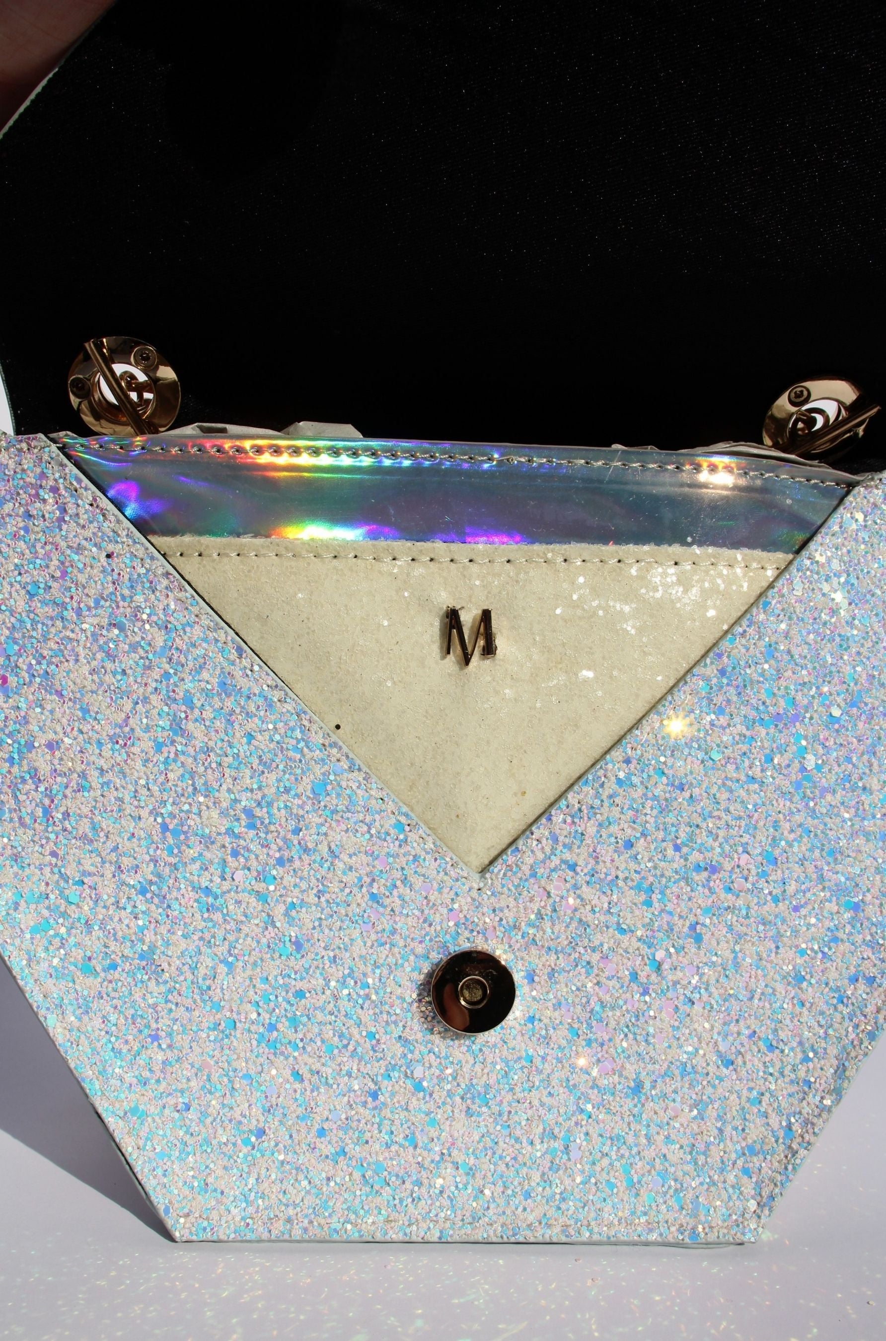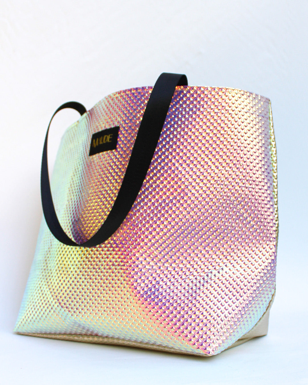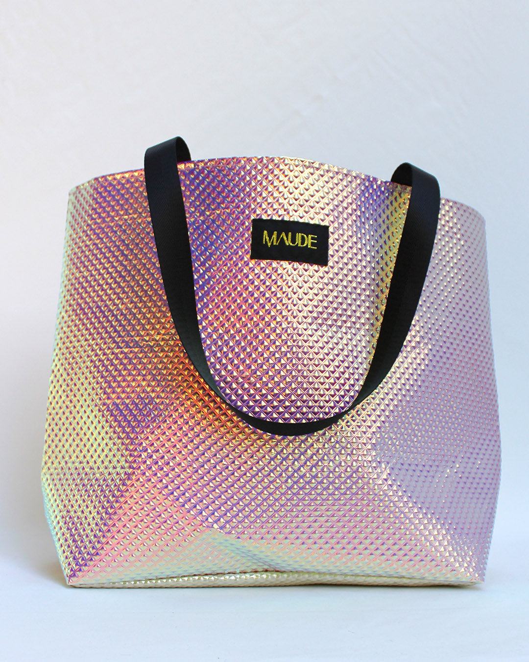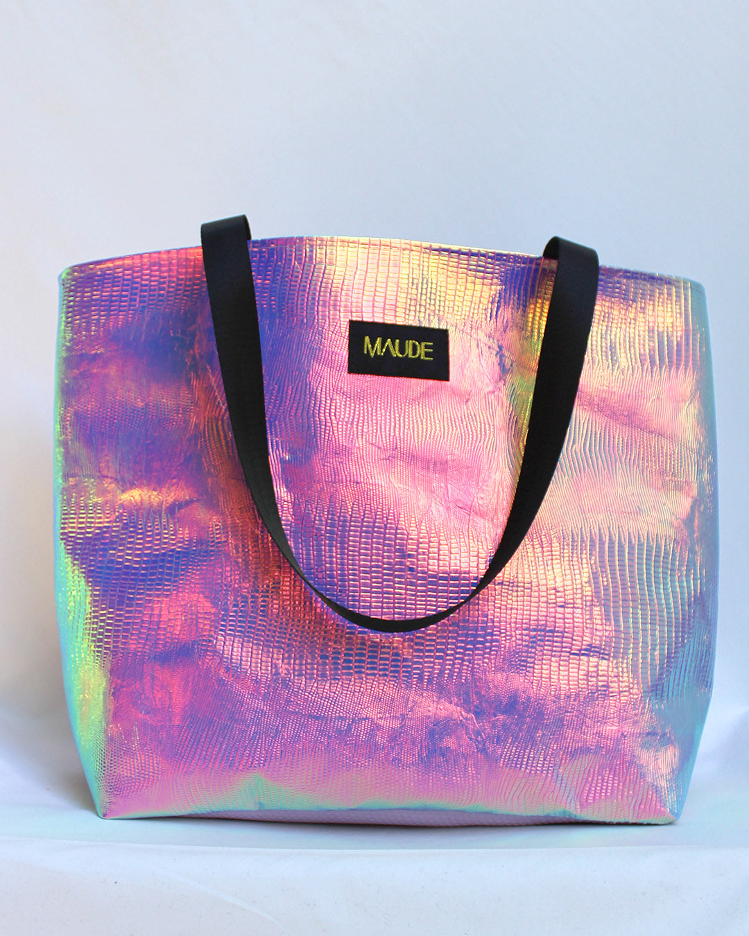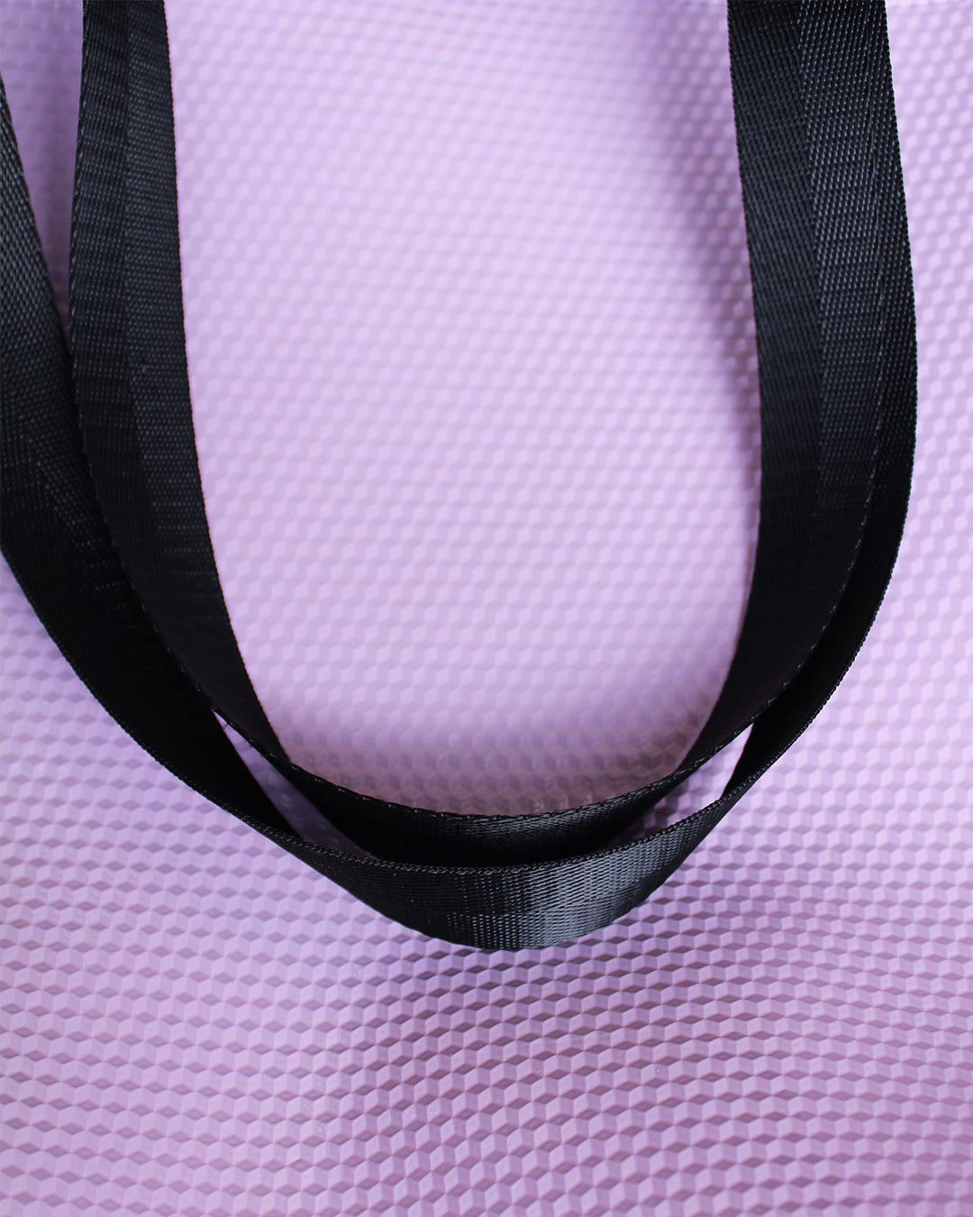 Side view of stylish pair of pastel pink and lilac sunglasses with a brown gradient lense set against a white background. there is a gold 'M' on the arm of the frame.