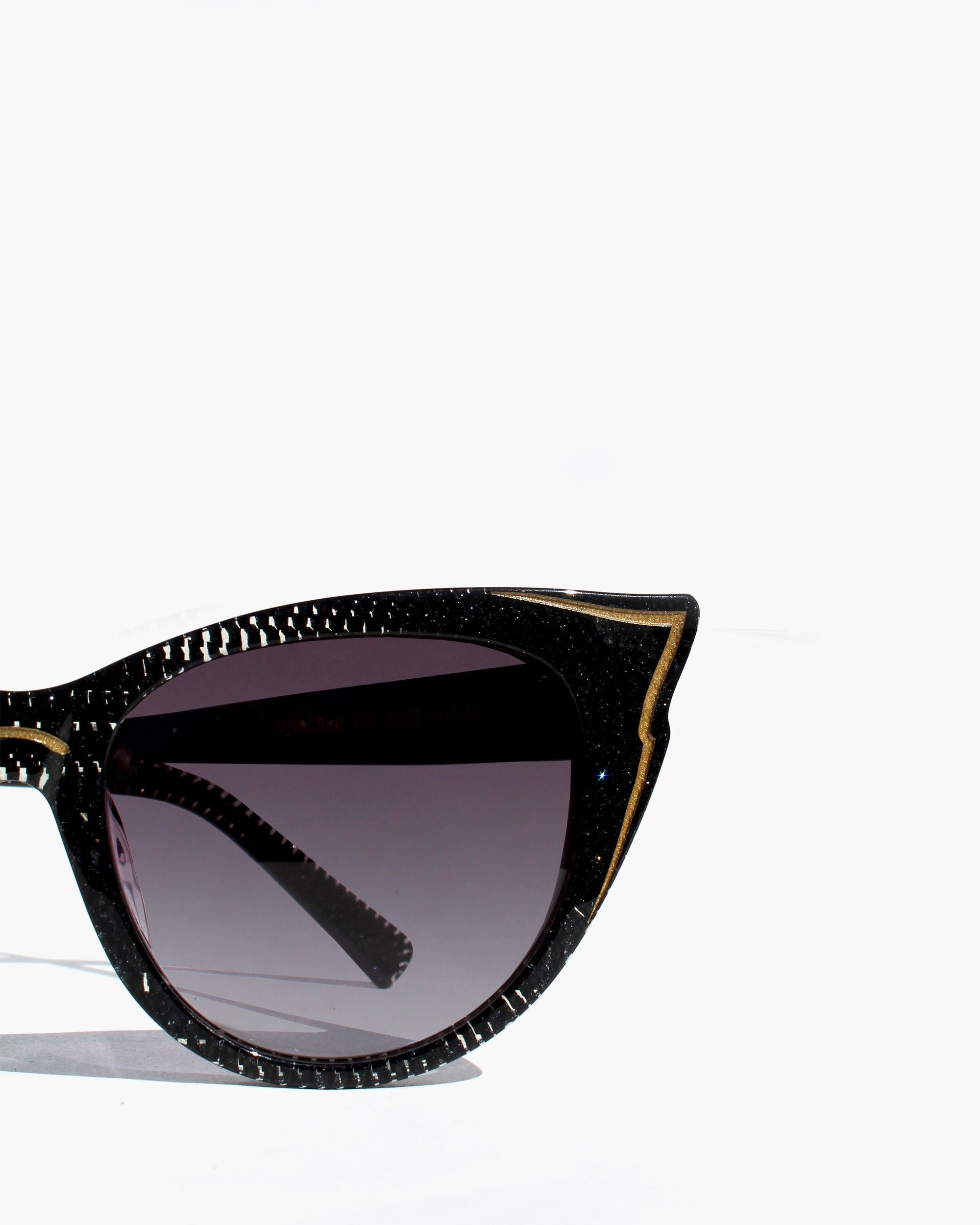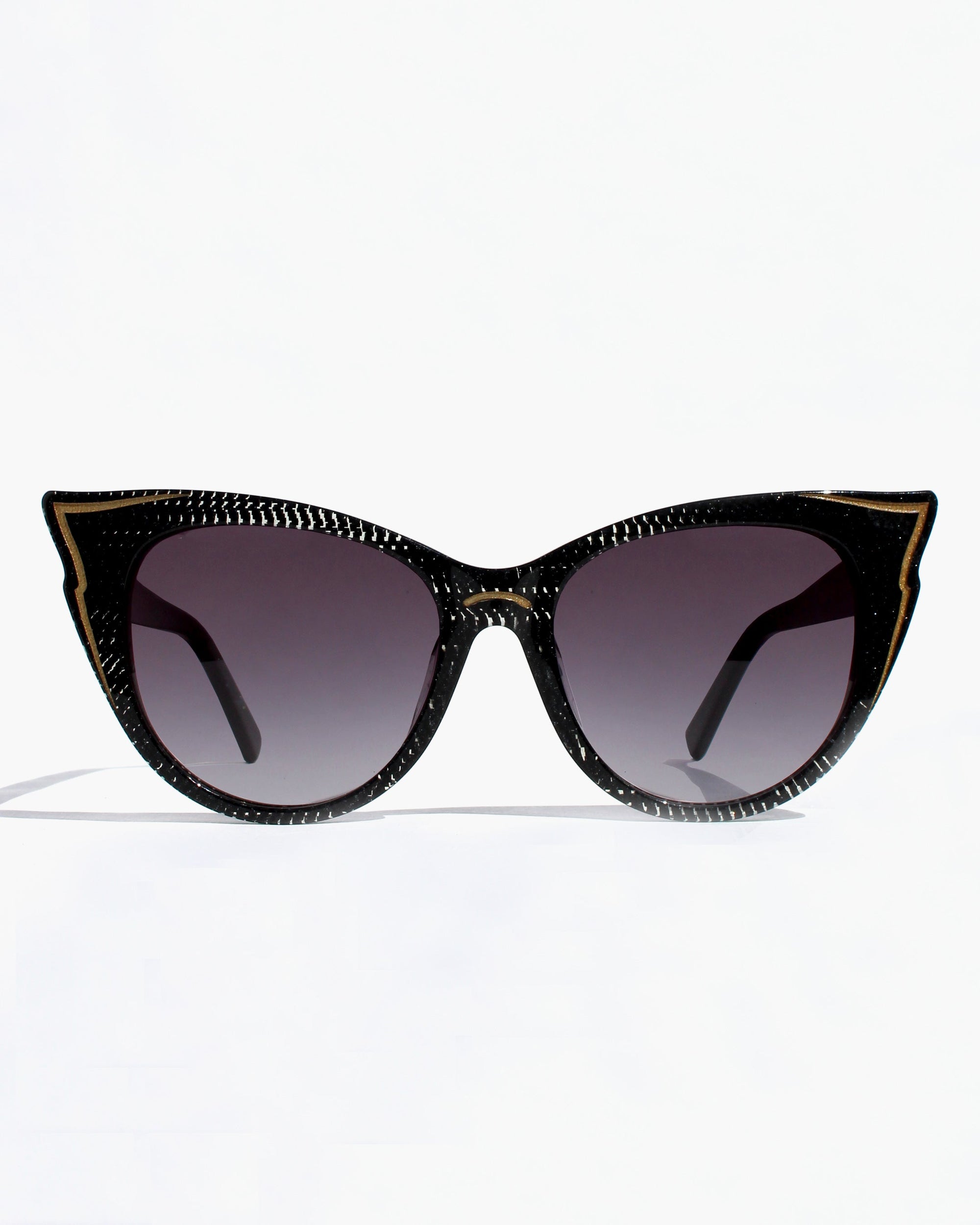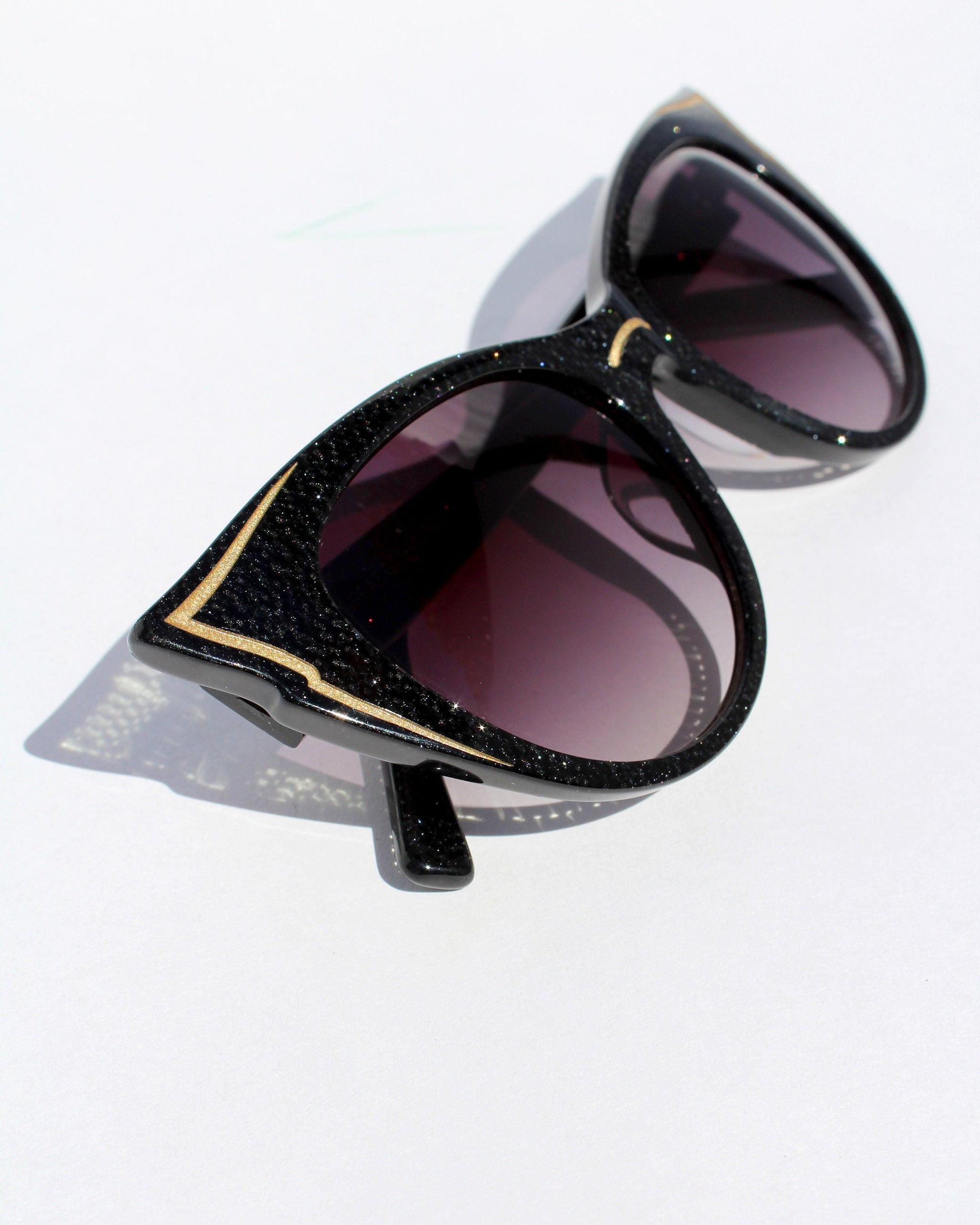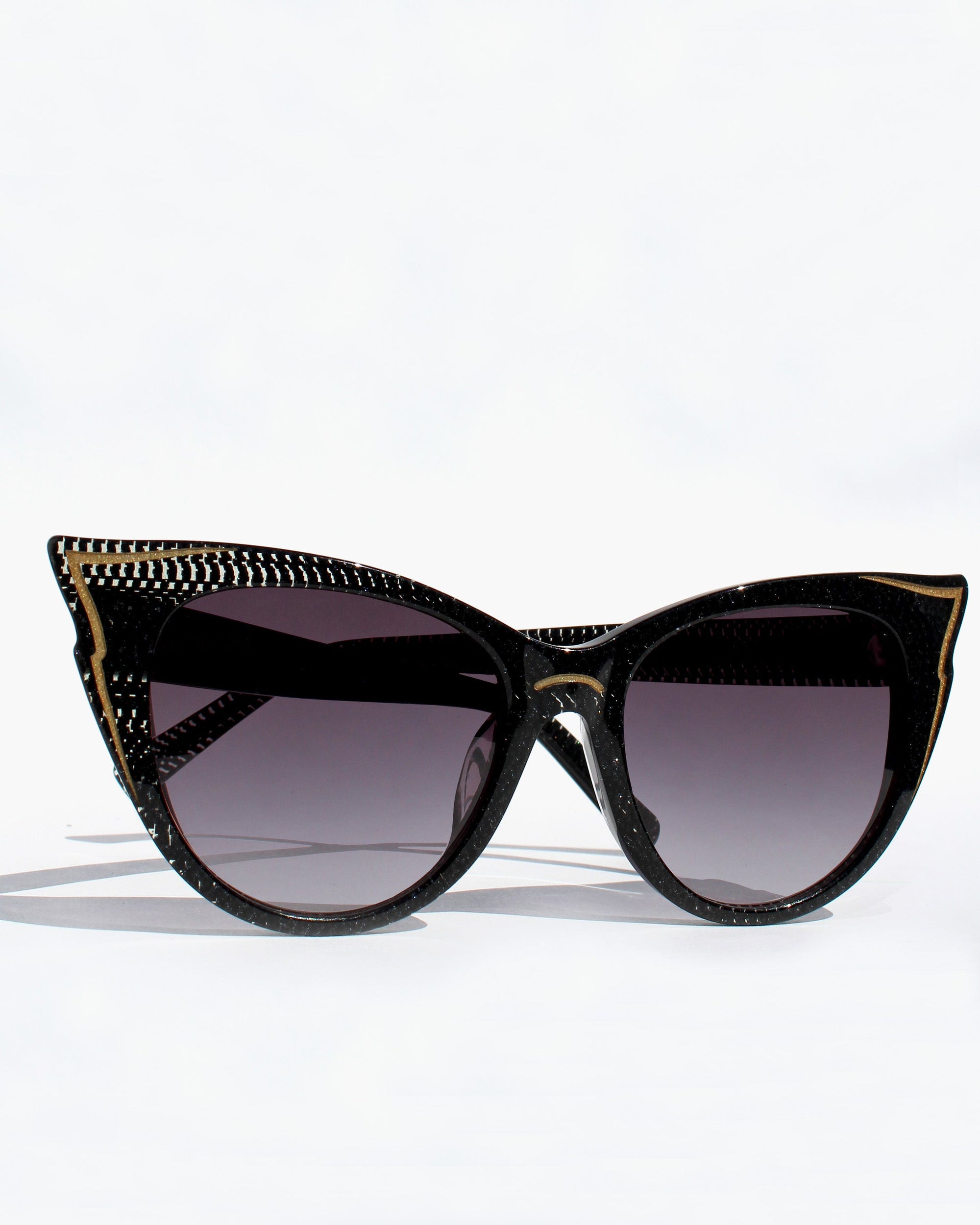 Front view of an elegant pink glittery cat eye framed sunglasses with a gold flick up top of the lenses and a brown gradient lense. Set against a white backdrop