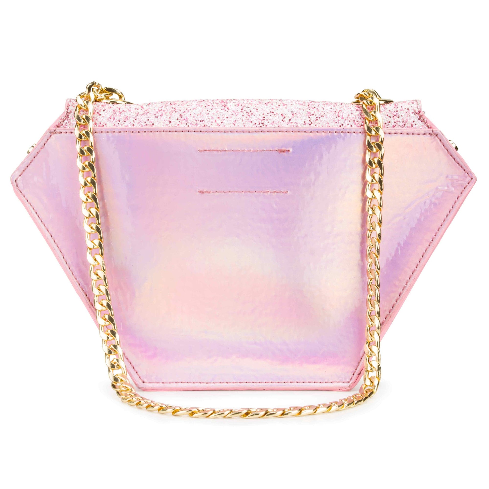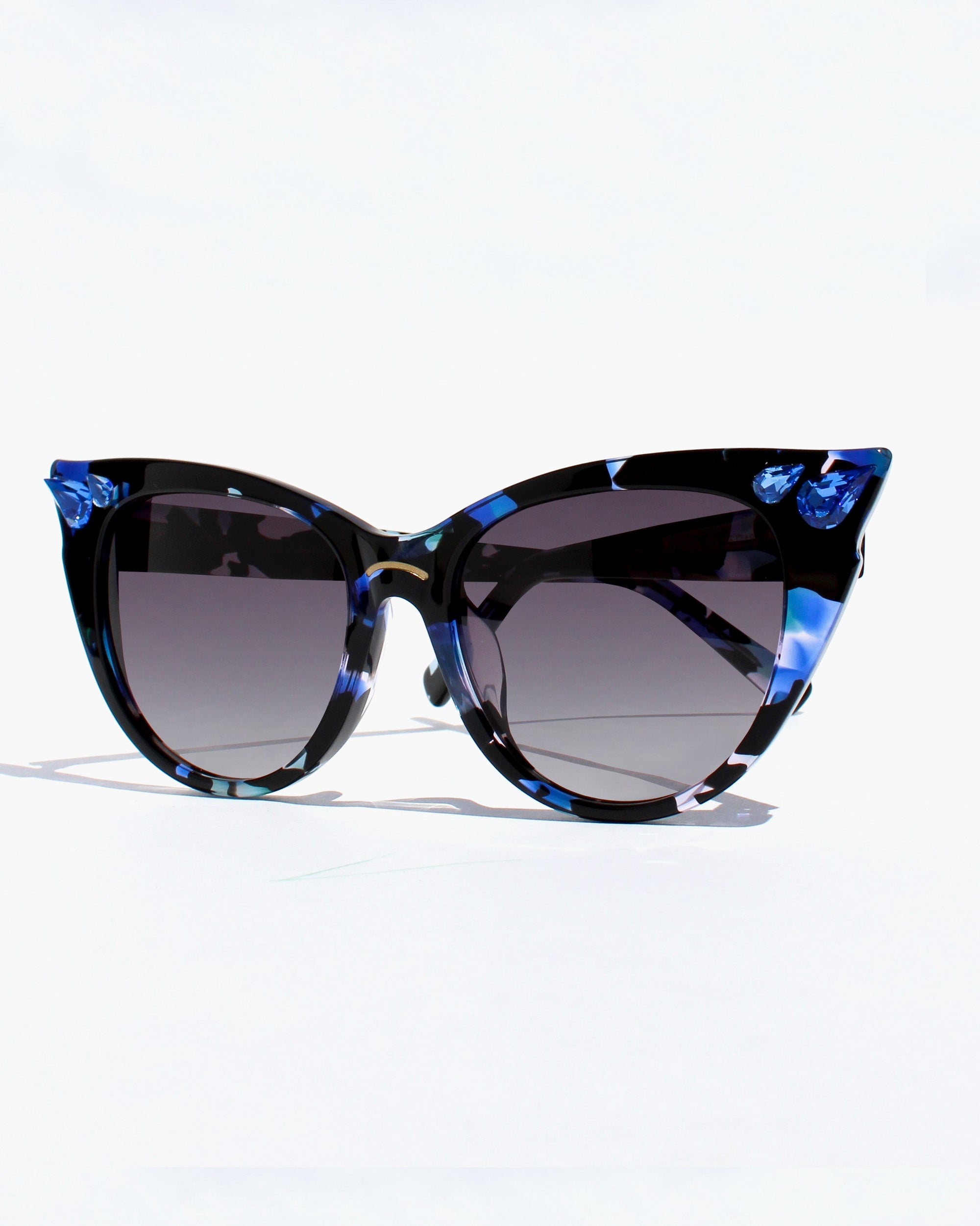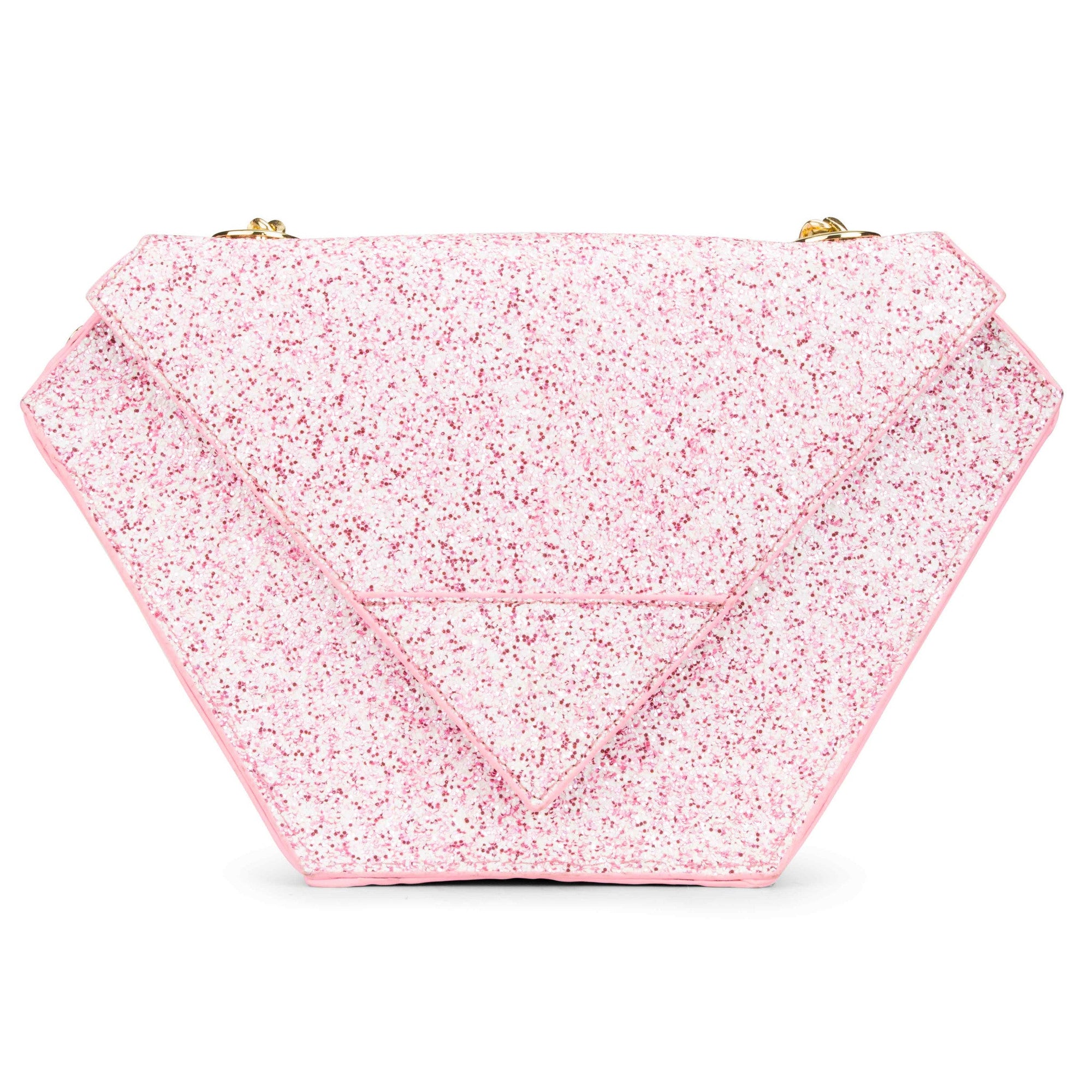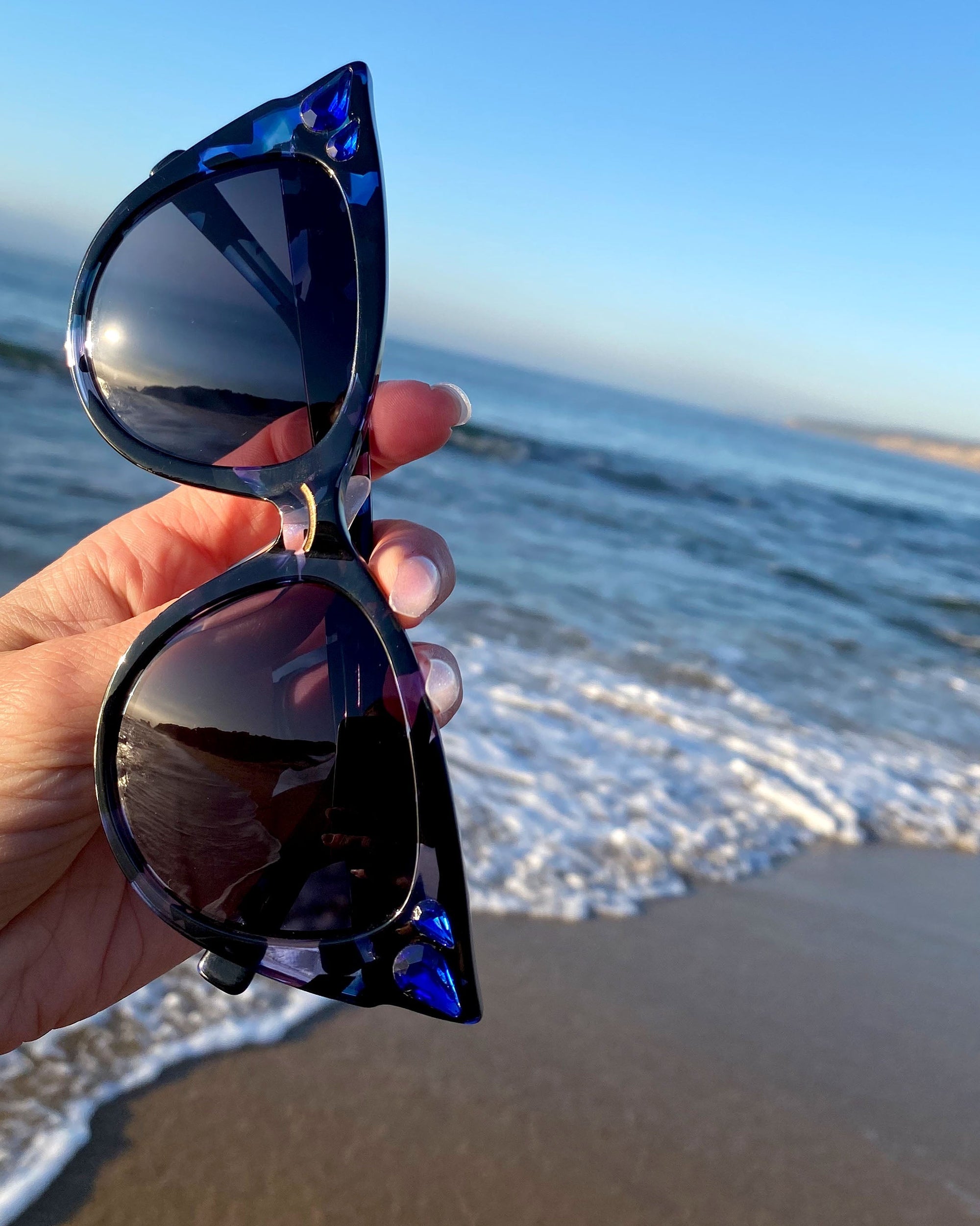 Front view of an elegant pink glittery cat eye framed sunglasses with a gold flick up top of the lenses and a brown gradient lense. Set against a white backdrop