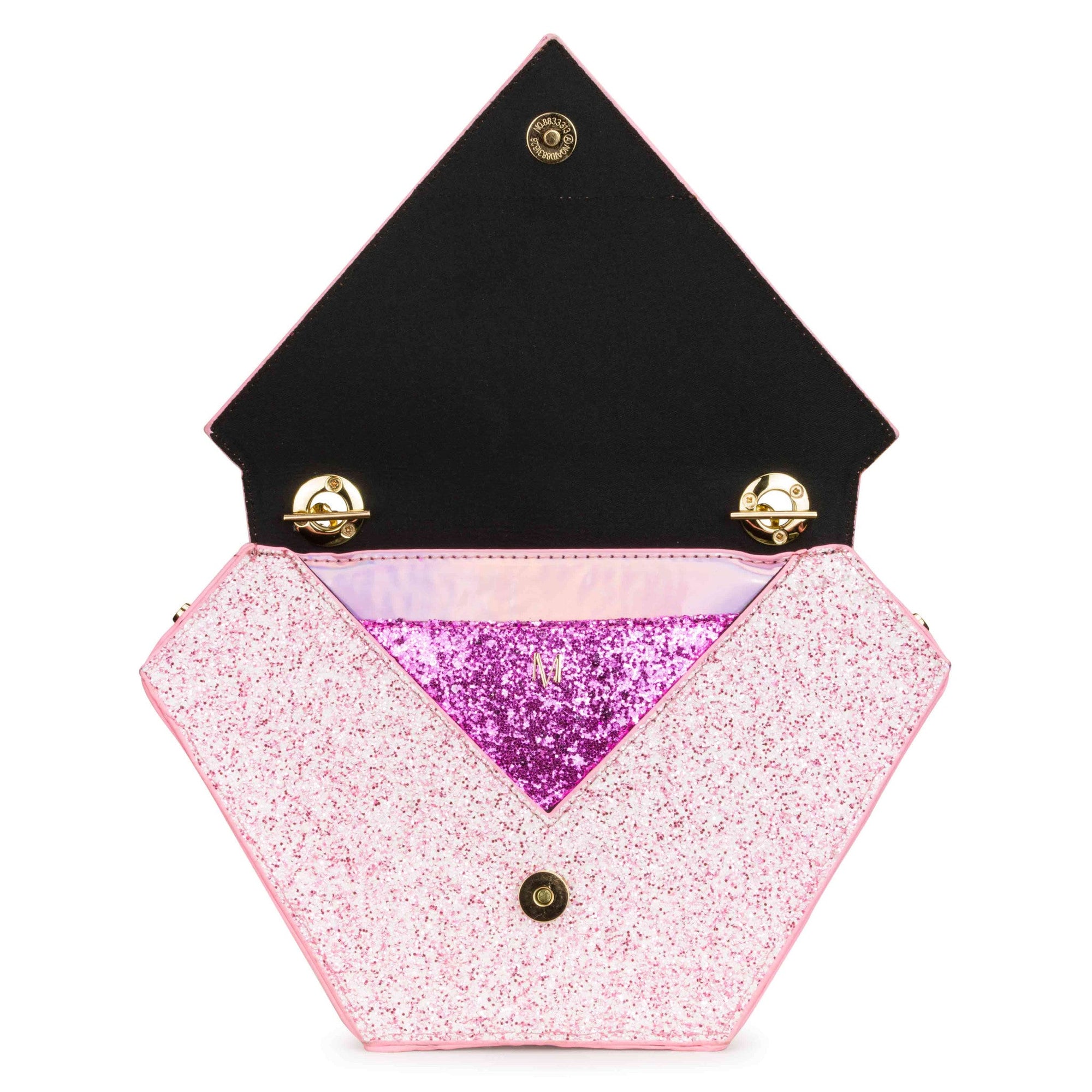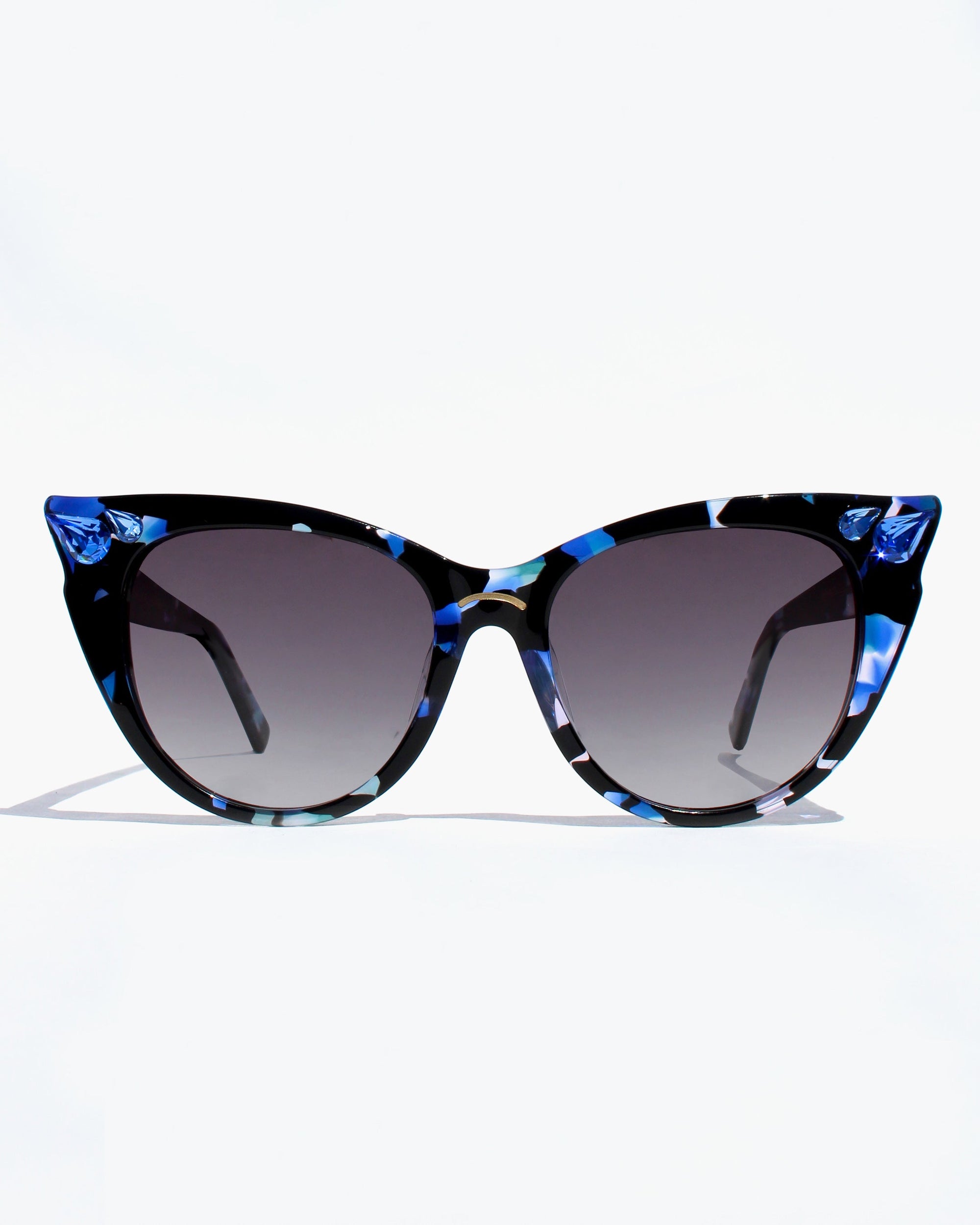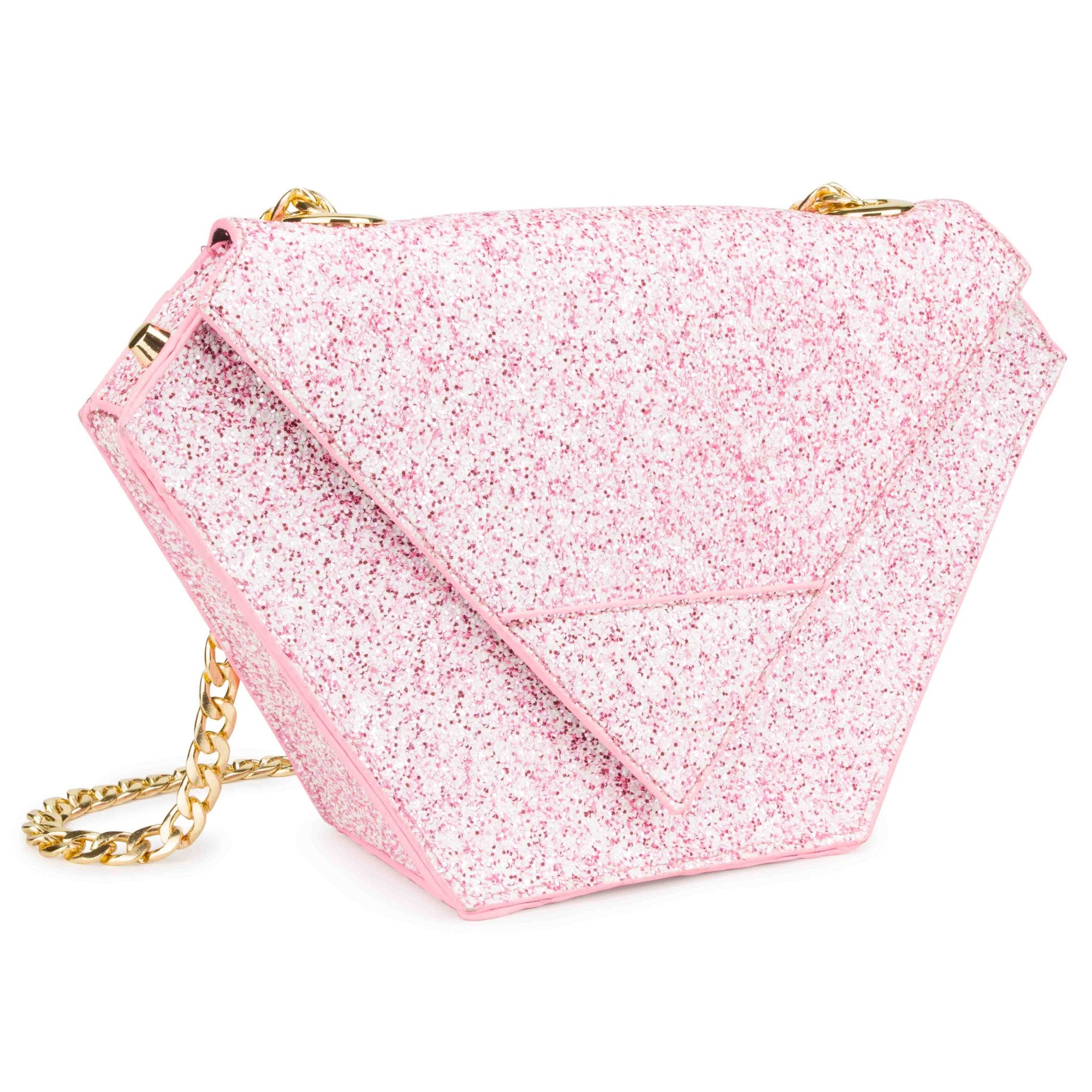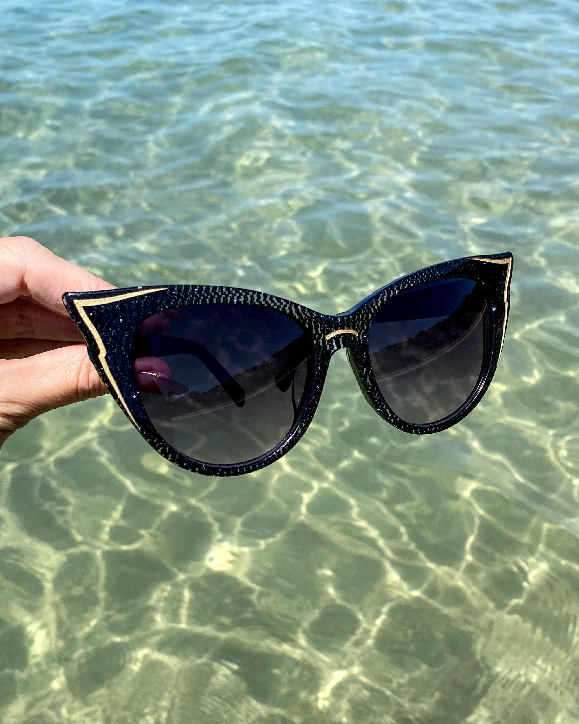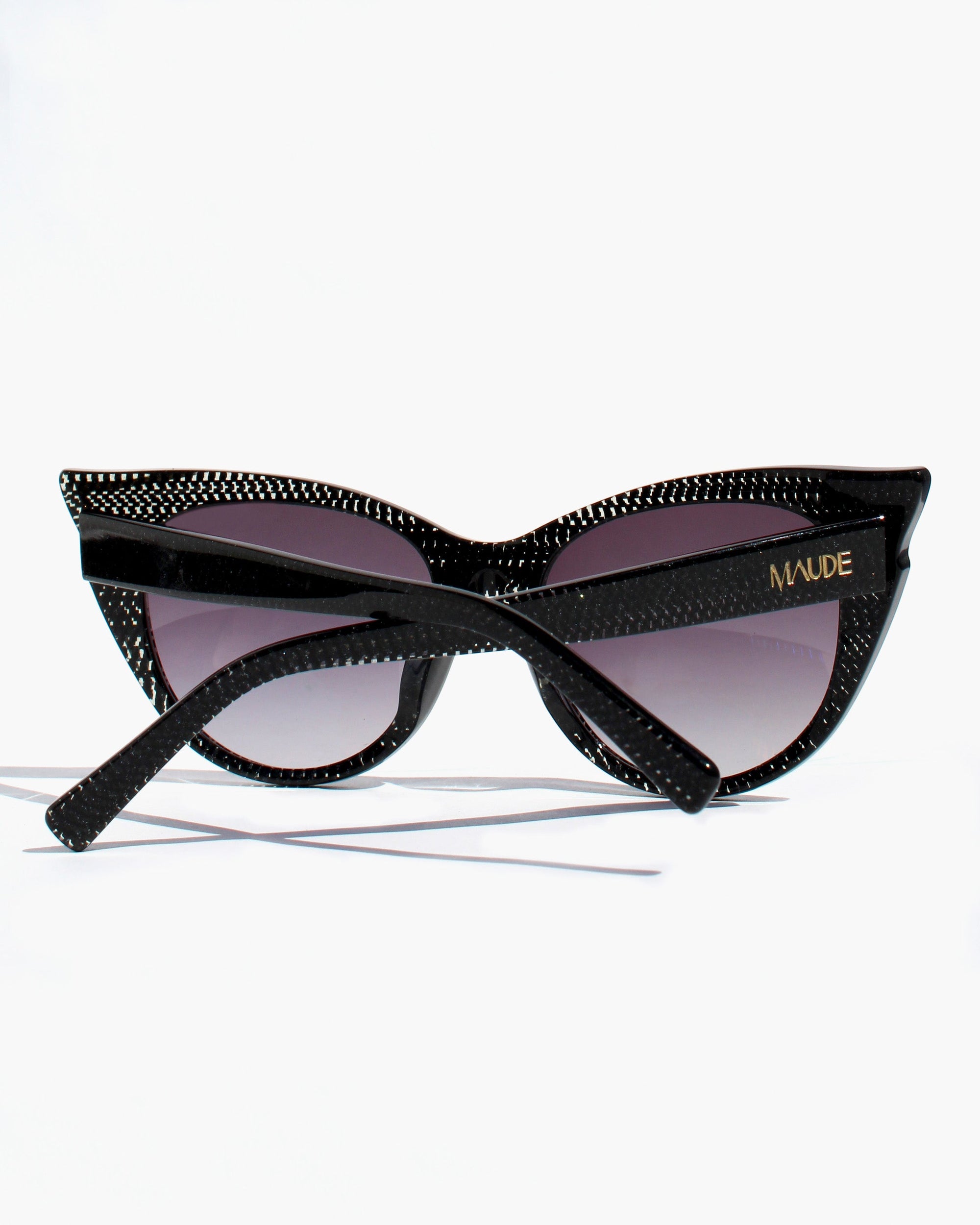Front view of an elegant pink glittery cat eye framed sunglasses with a gold flick up top of the lenses and a brown gradient lense. Set against a white backdrop