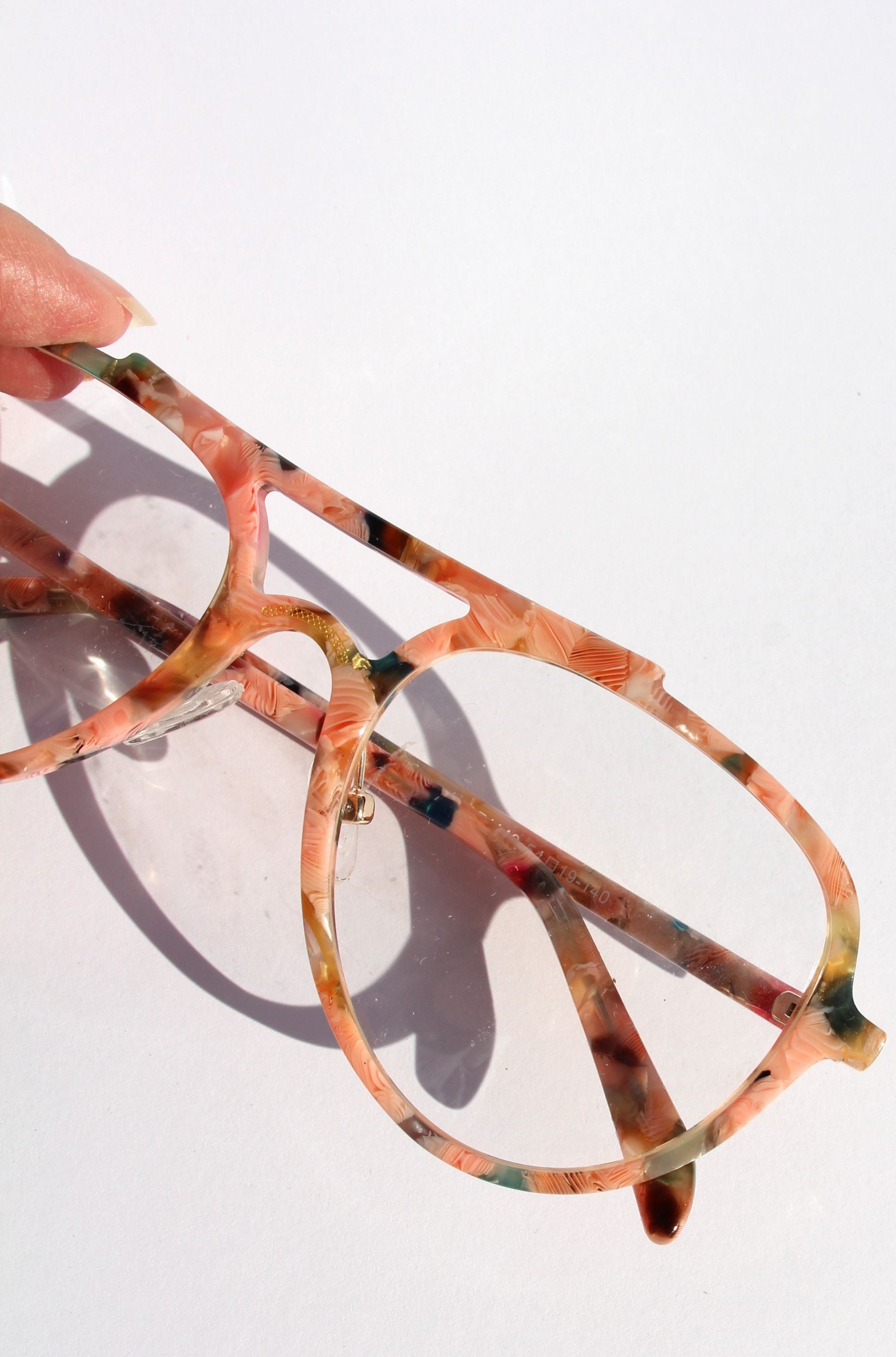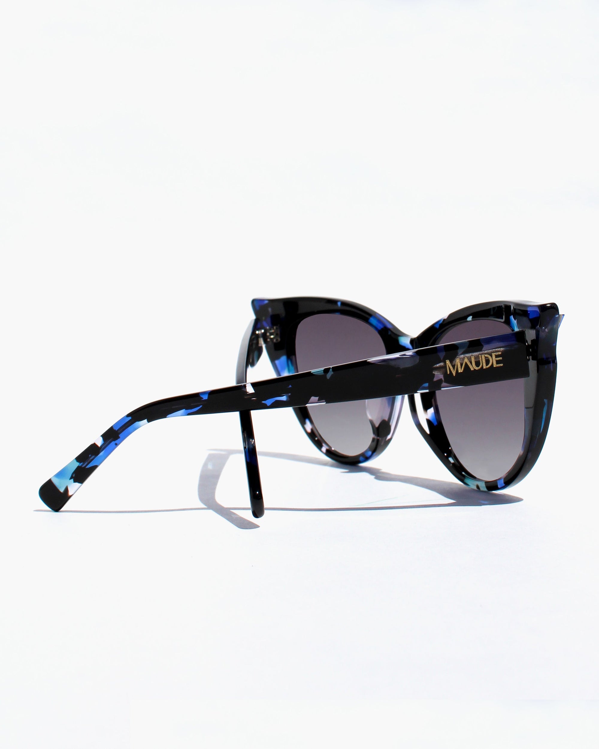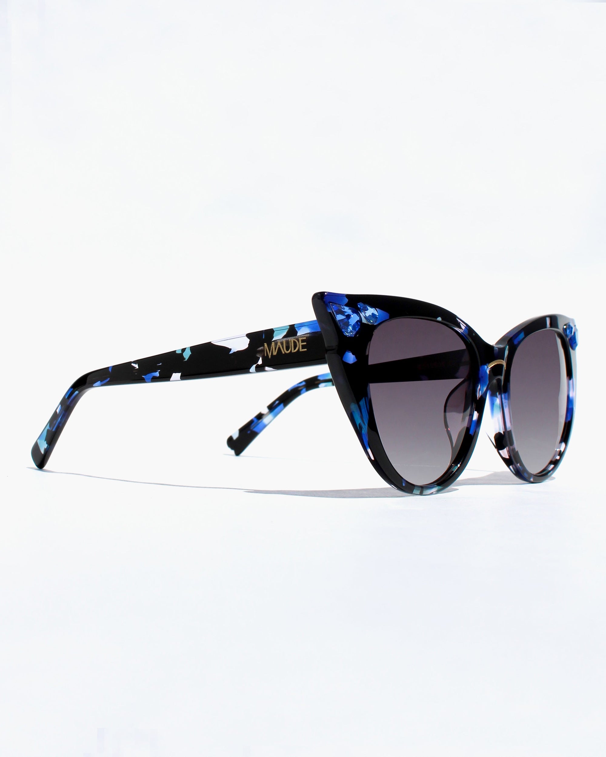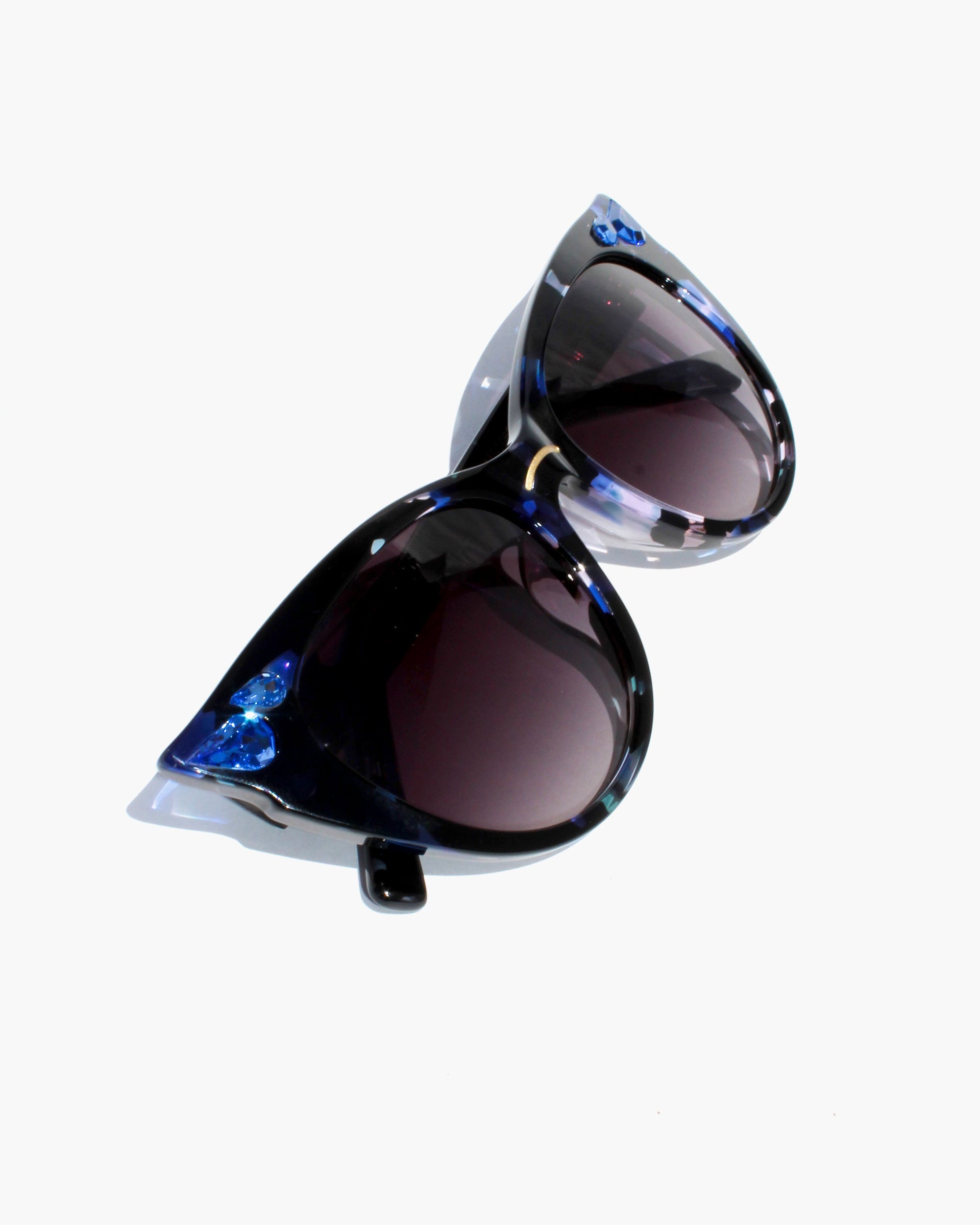 Front view of an elegant pink glittery cat eye framed sunglasses with a gold flick up top of the lenses and a brown gradient lense. Set against a white backdrop