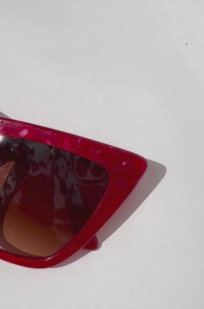 Rubie ~ Sharp cat-eye sunglasses in red marble with micro crystal detailing