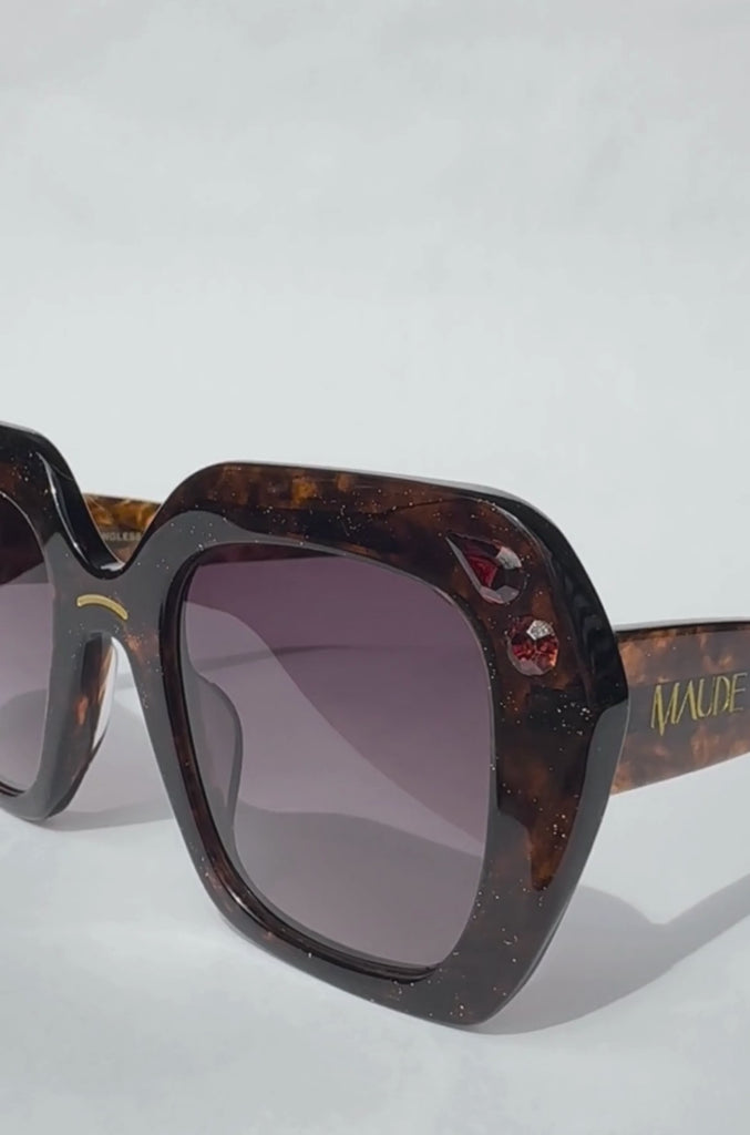 A statement oversized tortoiseshell frame flecked with silver glitter and finished with matching crystals in glossy coffee hues.